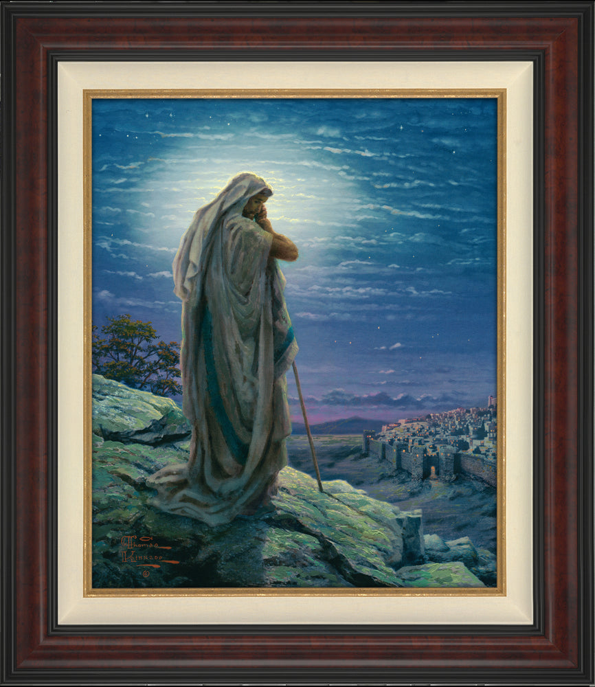 The dramatic figure of a prophet occupies the rocky heights above the city. To my mind, he is a Christ figure, but I have treated him with a deep spirituality that could well be embraced by people of other beliefs. Illuminated by a radiant moon, this holy person prays with all the fervor of his faith, that the warm glow of moonlight can wrap the walled city in a spiritual blanket of serenity.