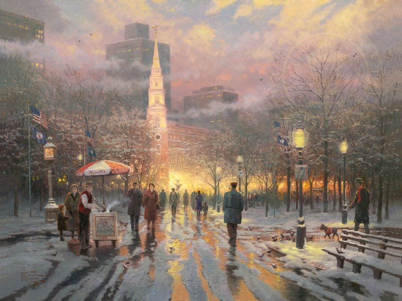 In Boston Celebration I return to a favorite subject at a different time of day and year. I first painted historic Boston Commons fourteen years ago on a damp fall afternoon. Now, I follow that collector favorite with Boston Celebration, meant to evoke the thrilling days following the Patriot's 2005 Super Bowl triumph which came on the heels of the curse-breaking Red Sox World Series. Flags celebrating the champions festoon the square; blazing lights seem to herald the exciting moment; the glowing facade of Park Street Church looms like a victory torch.