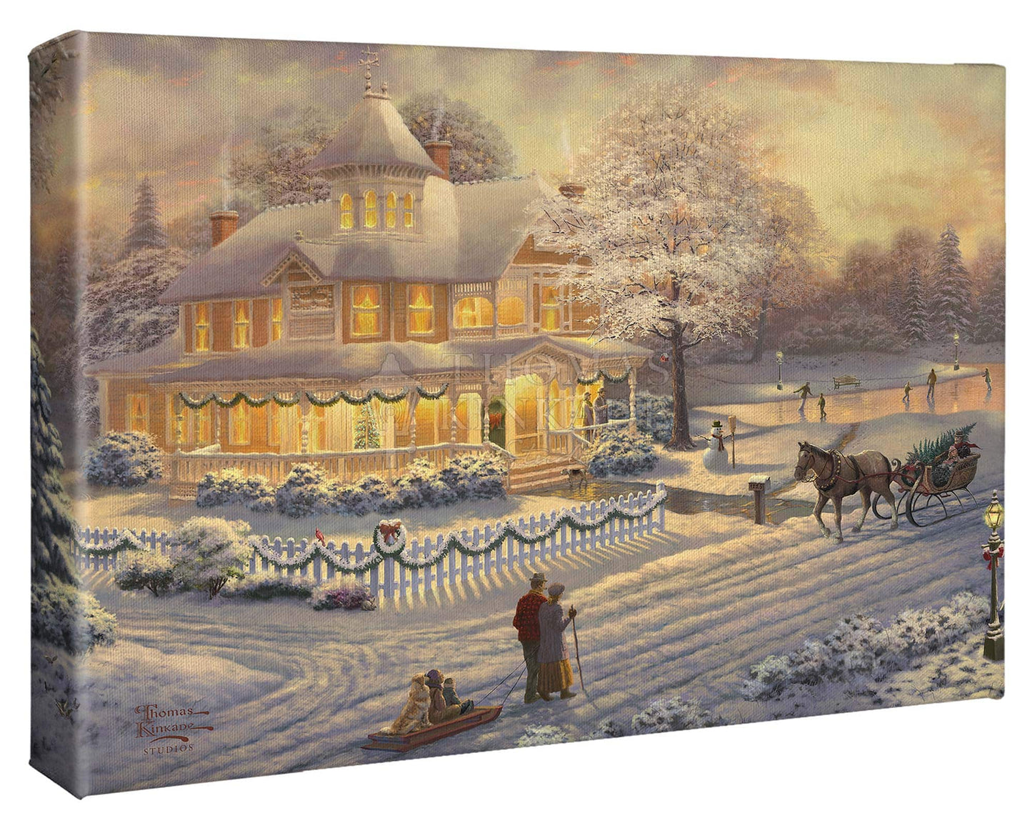 Come one, come all to our winter party! The snowman invites you to join the other guests on the skating pond. Or would you prefer to sit on the bench and watch the merriment? With the crispness in the air, you may want to enjoy a warm mug of hot chocolate on the porch. Our newest painting, Victorian Christmas Sunset, pays tribute to Thom’s beloved Victorian Christmas series. It offers you all these possibilities, and there is a guarantee that everyone will enjoy the colorful winter sunset.