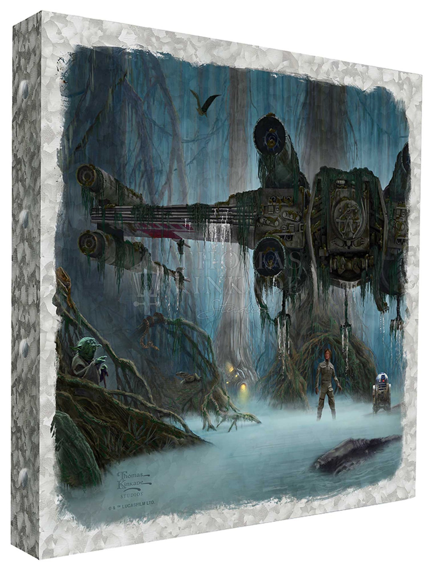The Rebellion Forces have escaped the Imperial Starfleet’s discovery of their new base on the ice world of Hoth™. Luke Skywalker™ has told R2-D2™ that they are not headed to the Rebellion rendezvous point but are traveling to the Dagobah™ System. Obi-Wan Kenobi™ has told Luke: “You will go to the Dagobah System. There you will learn from Yoda™. The Jedi™ Master who instructed me.” Emperor Palpatine™ has told Darth Vader™ that there is a great disturbance in the Force, and the enemy is the young rebel who destroyed the Death Star™. This young rebel is the son of Anakin Skywalker™, and the Force is strong with this one. During their initial meeting, Yoda states that he cannot teach the boy, as Luke has no patience and is too old. Obi-Wan reminds Yoda that Luke will learn patience. “Will he finish what he begins?” asks Yoda. After an intense training session, Luke’s X-Wing slips deeper into the swamp where he landed. Luke’s attempt to lift his fighter out and onto drier land fails, and it slips completely under the murky water. After Luke has turned away in frustration, Yoda uses the Force and deftly lifts the X-Wing out of the swamp and onto drier land. “I don’t believe it!” says Luke. “That is why you fail,” replies Yoda. Luke must always remember that his greatest ally is the Force. Thomas Kinkade Studios is pleased to present Do. Or do not. There is no try.