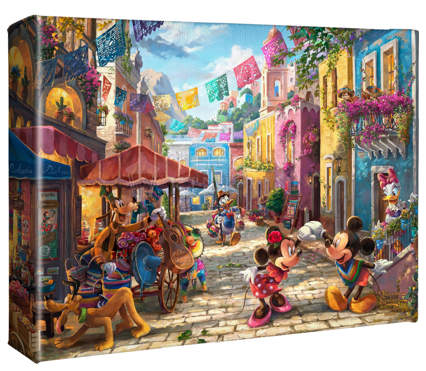 In the Passport to Adventure series by Thomas Kinkade Studios, Disney’s Mickey Mouse and Minnie Mouse, along with some of their closest friends, explore famous travel destinations around the world. This time Mickey and friends are visiting a Pueblo Mágico in Mexico. In Disney Mickey and Minnie in Mexico by Thomas Kinkade Studios, we find the pair dancing to a tune carried by a gentle breeze blowing through the colorful papel picado as Goofy and Daisy Duck happily cheer them on. Donald Duck has headed back from a morning of fishing, with enough to provide a feast for all. However, Pluto appears to prefer the sweets in the candy store to Donald’s catch. Always ready for fun, the sombrero-wearing Chip and Dale look down on el pueblo, eager to start a new adventure.Product Specifications