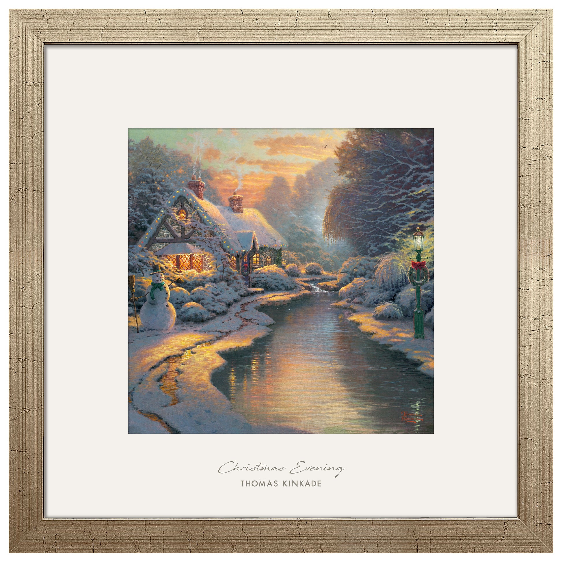 In Christmas Evening I return to the cottage that is the centerpiece of "A Quiet Evening" - the thatch-roofed hutch many collectors have told me is their favorite Kinkade home. It is the evening before Christmas day, and the joyous symbols of the season abound. The cozy cottage is festooned with Christmas lights; a wreath is hung on the door; a previously unseen gas lamp heralds visitors from across the icy stream. Perhaps you can even imagine children gathered around the tree, singing Christmas carols while the family prepares to savor a lovingly prepared meal. Surely the Christmas spirit is alive within these stone walls.