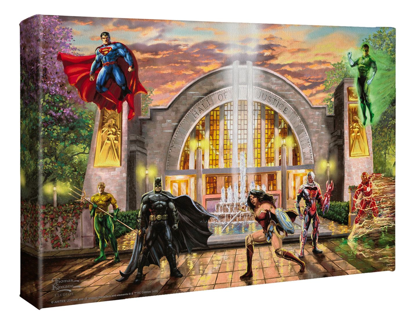 In Hall of Justice by Thomas Kinkade Studios, our intrepid heroes – Batman, Wonder Woman, Cyborg, Aquaman, Green Lantern, Superman, and The Flash – have been called into action. Unified, their incredible superpowers are exponentially stronger, making them virtually unstoppable as they stand ready to protect the world.