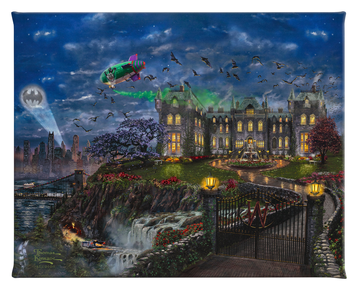 Thomas Kinkade Studios' Wayne Manor™ captures the excitement of the moment when the Batmobile™ emerges from the secret entrance below Wayne Manor, responding to the Bat-Signal™. Which arch-nemesis is causing Commissioner Gordon to signal for the Dynamic Duo's assistance? Can Batman and Robin expect to encounter The Joker™, or maybe Ra's al Ghul?