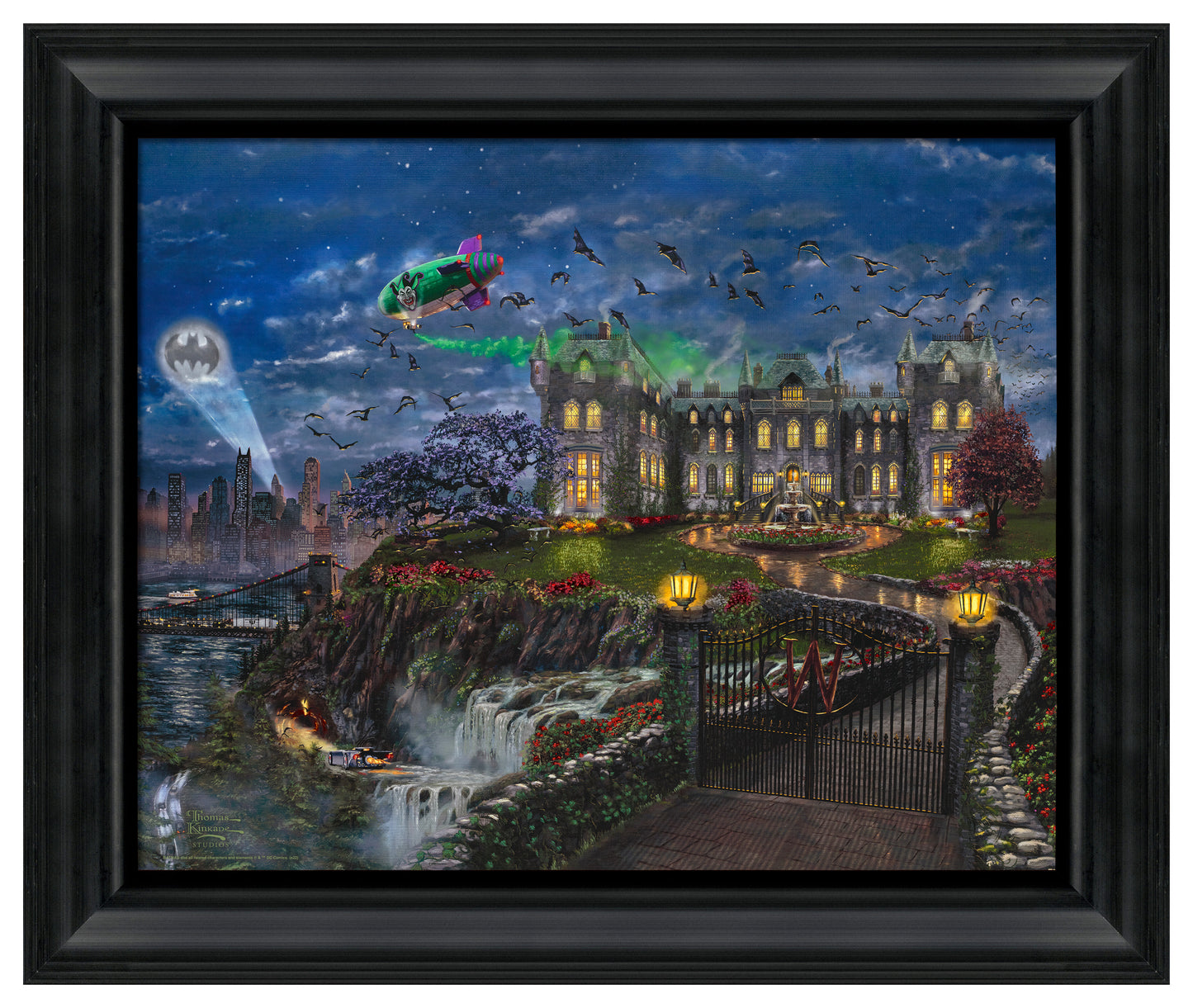 Thomas Kinkade Studios' Wayne Manor™ captures the excitement of the moment when the Batmobile™ emerges from the secret entrance below Wayne Manor, responding to the Bat-Signal™. Which arch-nemesis is causing Commissioner Gordon to signal for the Dynamic Duo's assistance? Can Batman and Robin expect to encounter The Joker™, or maybe Ra's al Ghul?