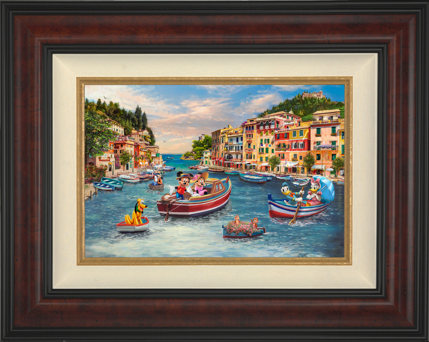 In Disney Mickey and Minnie in Italy by Thomas Kinkade Studios®, the bright sunshine is casting a soft warm glow over the dazzling blue of the Mediterranean Sea. Mickey Mouse and Minnie Mouse have set off in their motorized boat for a fun-filled afternoon adventure. Pluto is happily sitting in his own small boat being towed behind. All are admiring the flowers that Chip & Dale have placed aboard their small vessel. Daisy Duck is enjoying the warmth of the sun, as Donald Duck rows them towards Mickey and Minnie’s boat. Off on his own, Goofy has fashioned a functional watercraft out of a barrel and is happily fishing for his meal.