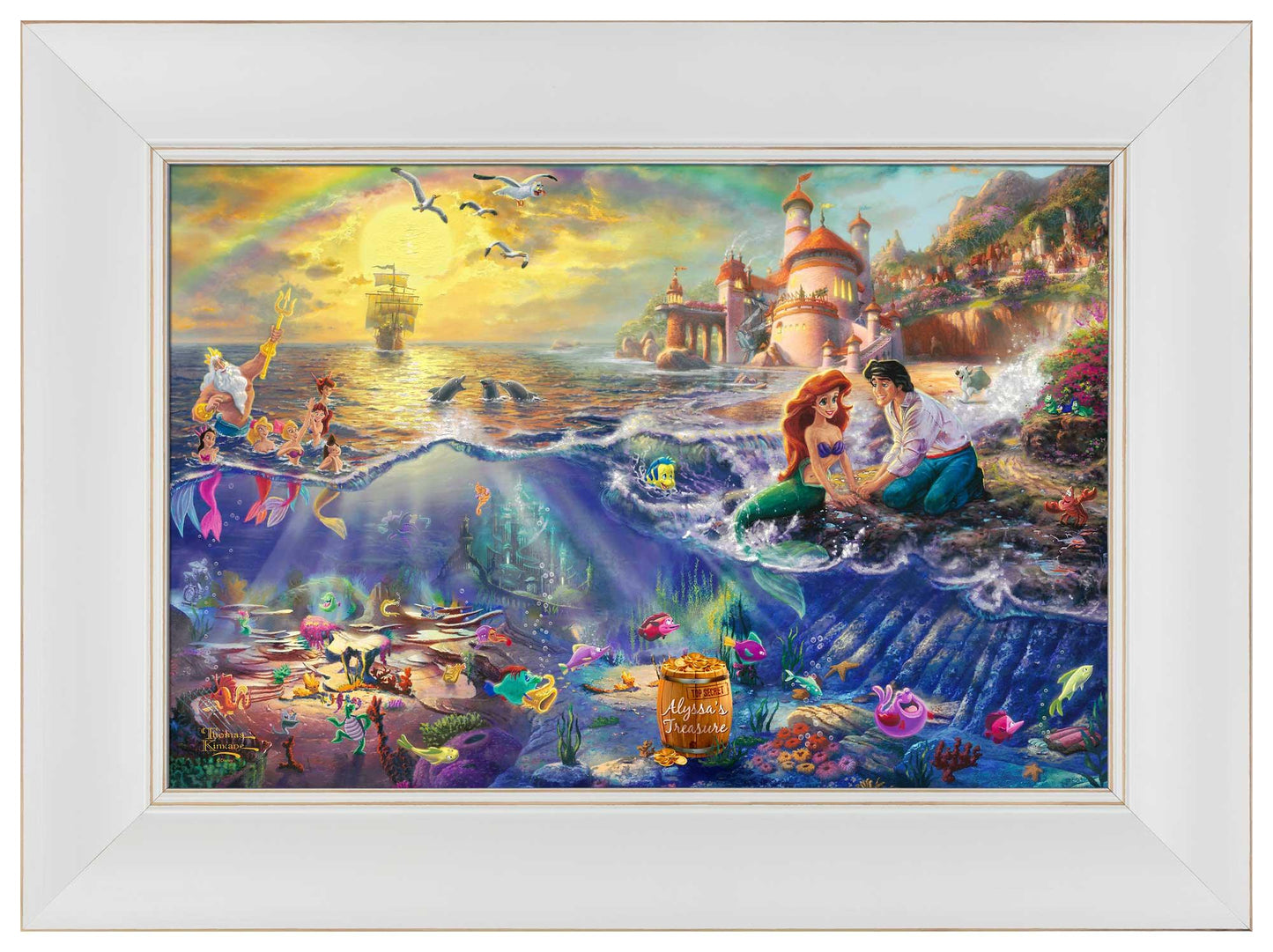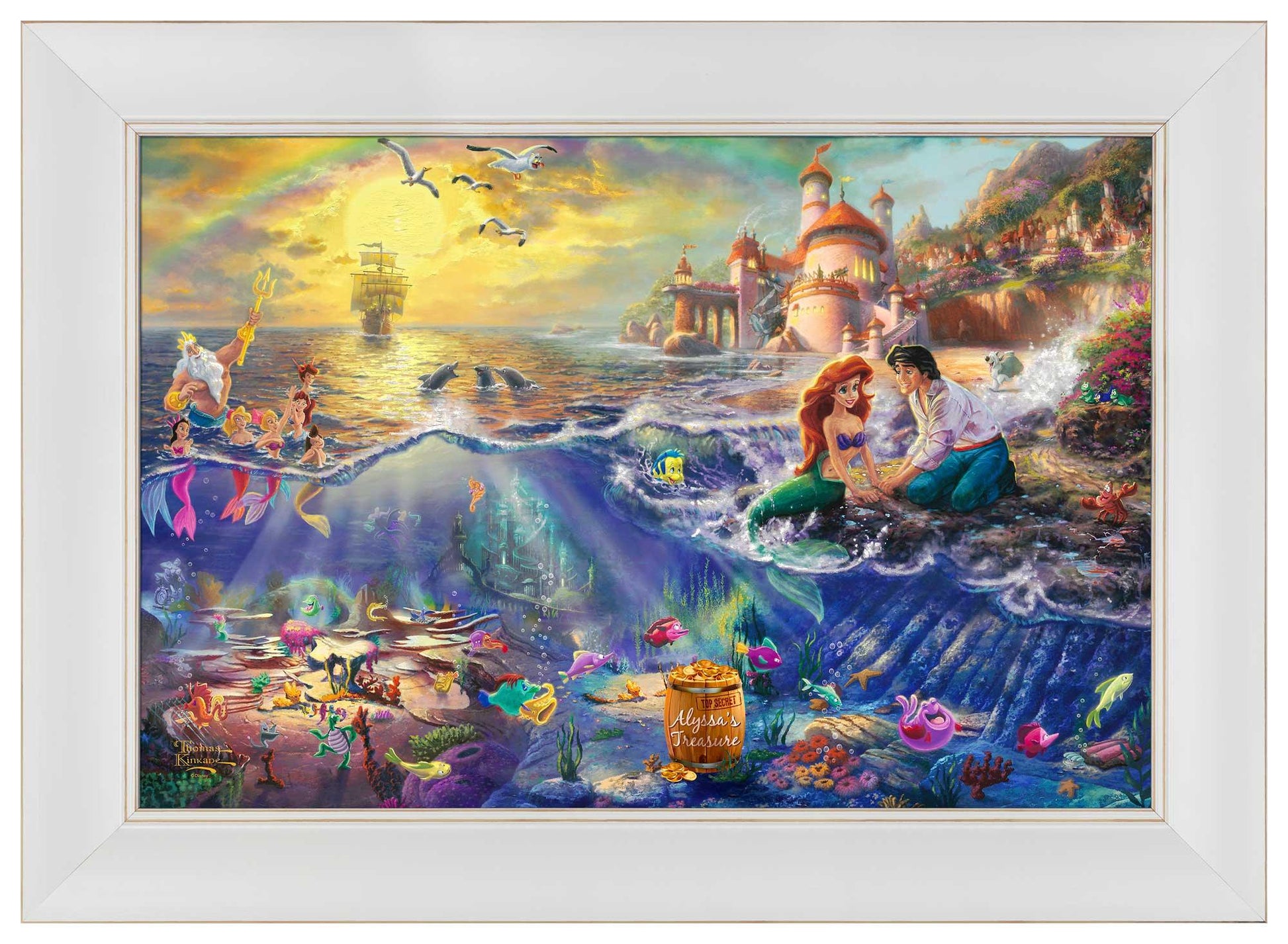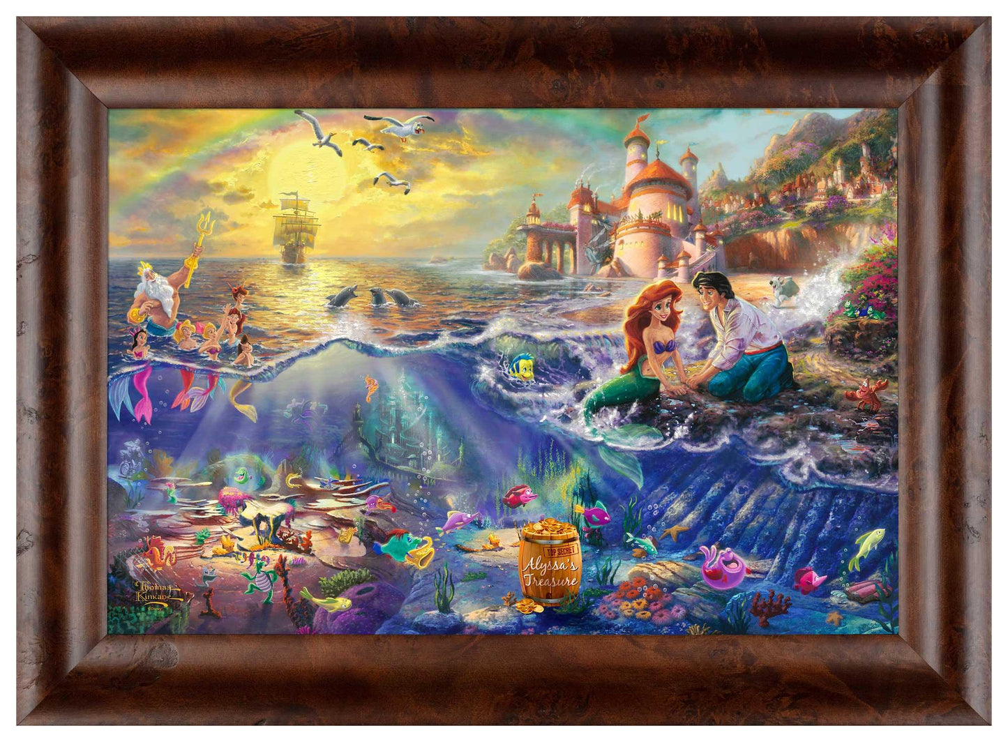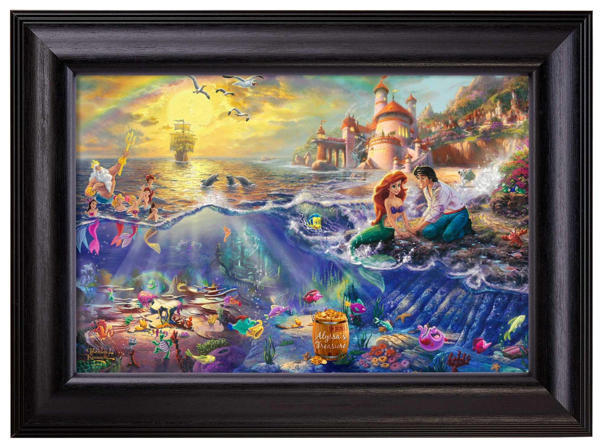 Disney Dreams Collection by Thomas Kinkade Studios is now available as a personalized framed canvas! Specify a line of personalization to the barrel of treasures in the image and you or someone special will feel part of this famous love story! Personalization information will be entered in your shopping cart during the checkout process, or please contact us for additional personalization requests. Open edition canvas framed. Available with multiple frame choices in multiple sizes. Open Edition Certificate of Authenticity included.