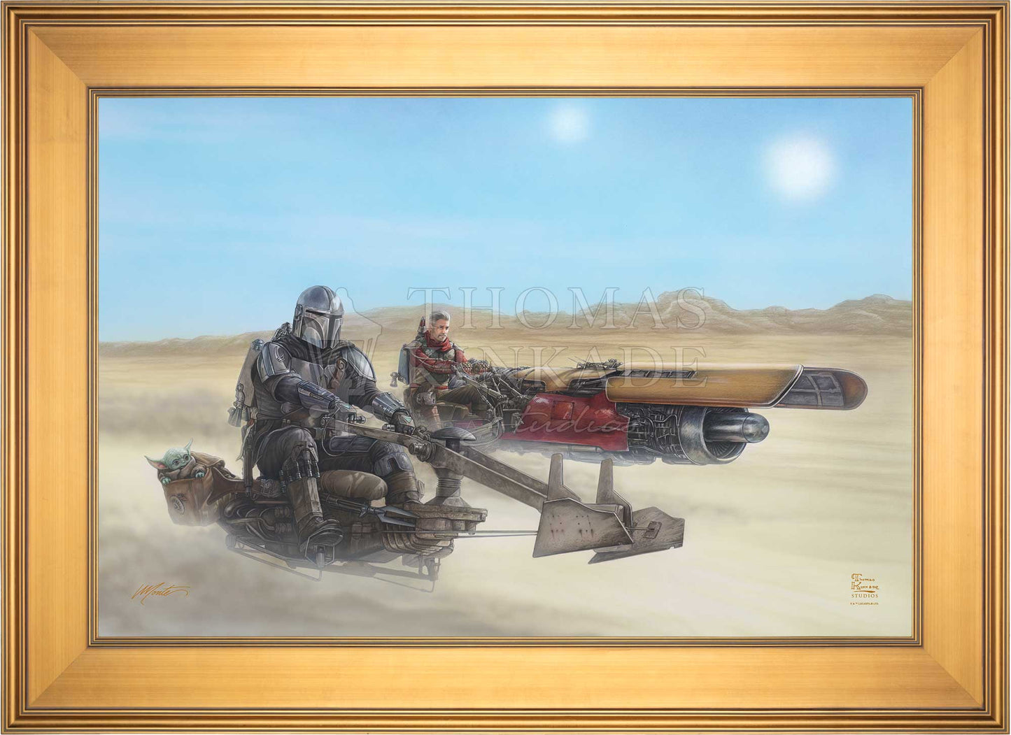 When the Mandalorian’s search for others of his kind takes him to the remote desert outpost of Mos Pelgo, he finds himself teaming up with a local Marshal to rid the nearby wastelands of a fearsome krayt dragon and has the opportunity to recover priceless Mandalorian armor once owned by the fabled Boba Fett™. This episode has all the classic earmarks of a true western complete with a remote dusty town and a Marshal in need of help, nearly leading to a gunfight in a saloon. In this Thomas Kinkade Studios painting, our weary gunslingers head out on their trusty steeds across the landscape searching for their prey and some much-needed help that they will most certainly need to bring down the beast they will undoubtedly face!