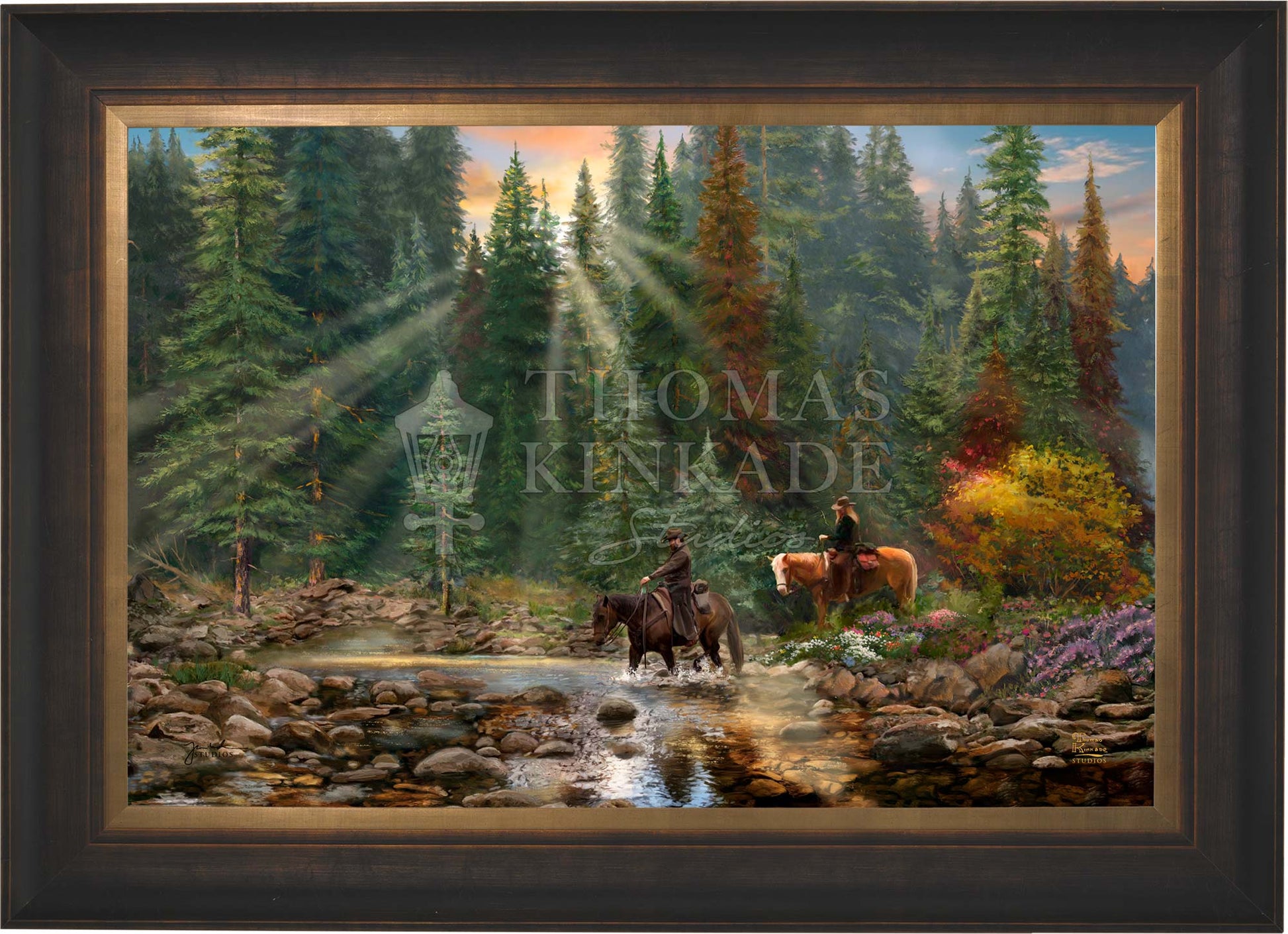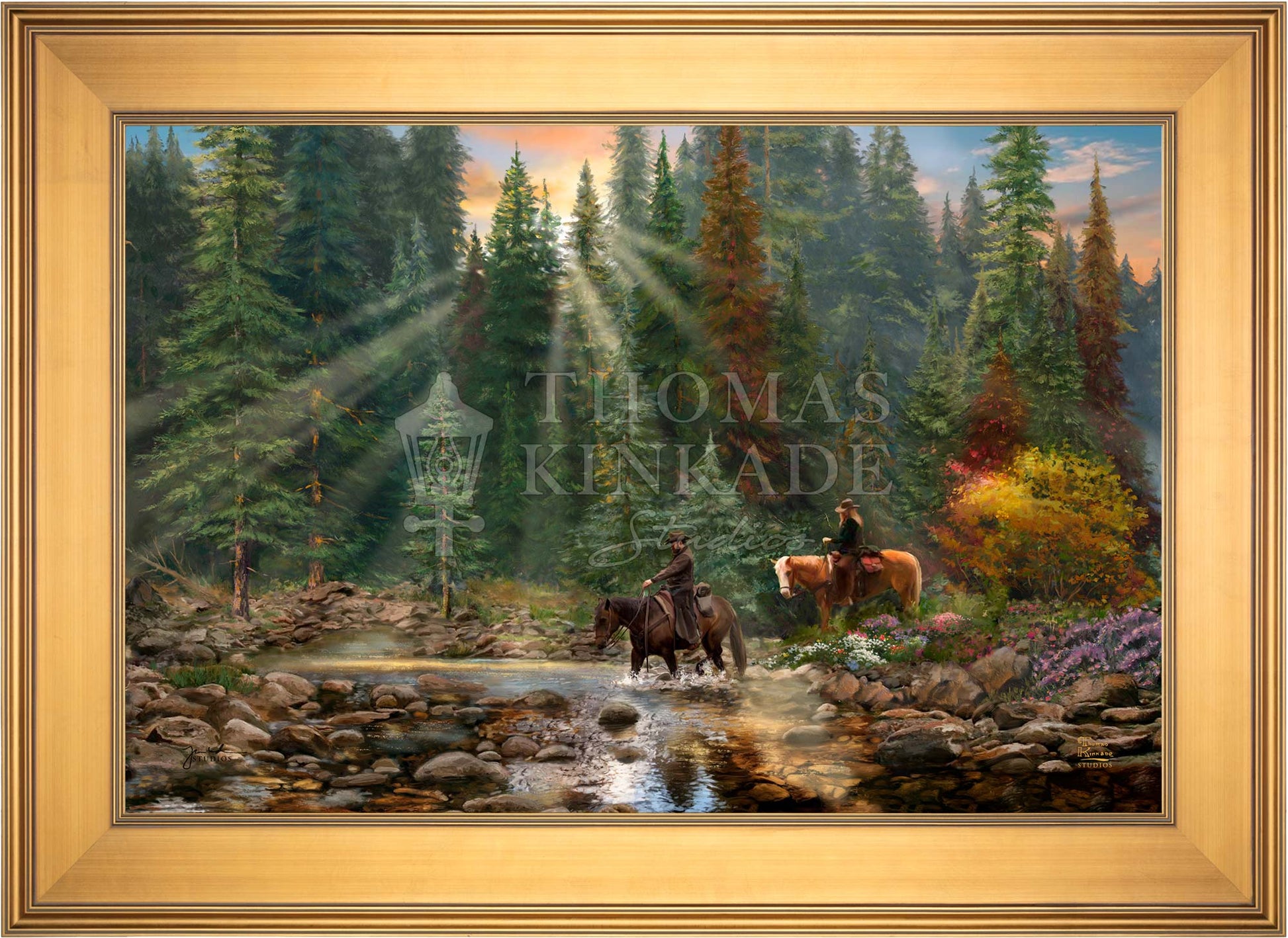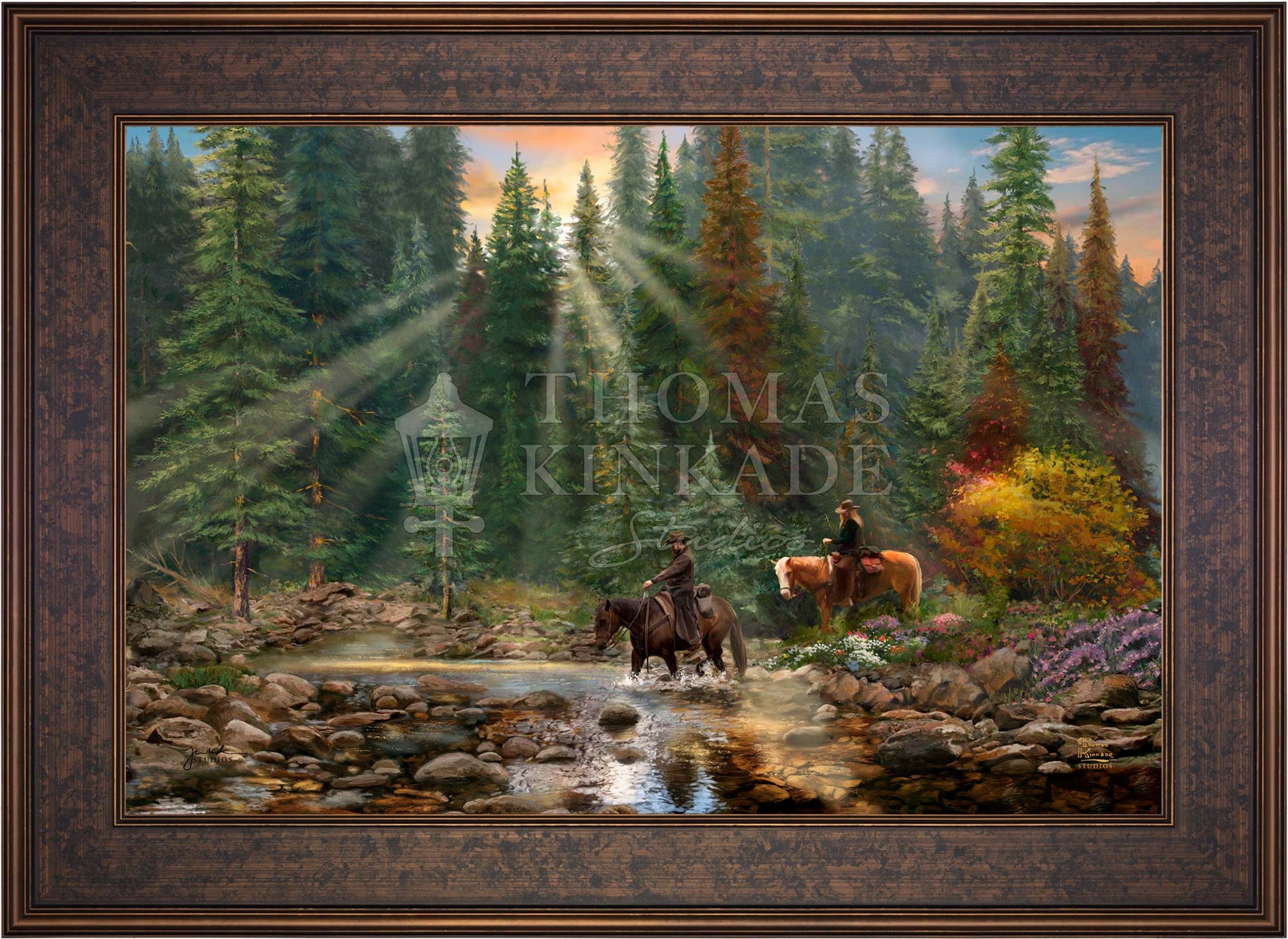 The Crossing by Thomas Kinkade Studios portrays two familiar riders on horseback fording a picturesque mountain stream after the end of a long cattle drive.