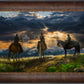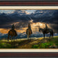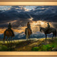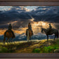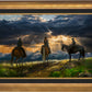 Under the Big Sky , a striking piece from the Yellowstone television series collection, captures the essence of Montana's raw beauty and the solitary grandeur of ranch life. Three riders are silhouetted against a spectacular sunset, where the sky erupts in brilliant oranges and purples above the snow-capped peaks of Paradise Valley. The painting portrays a moment of quiet contemplation as these guardians of the Dutton legacy survey their ancestral lands from horseback, while wildflowers dot the sage-covered hillside beneath them. The artist masterfully renders the interplay of fading sunlight and gathering dusk, embodying the show's themes of legacy, loyalty, and the enduring connection between the ranchers and the majestic landscape they've sworn to protect.