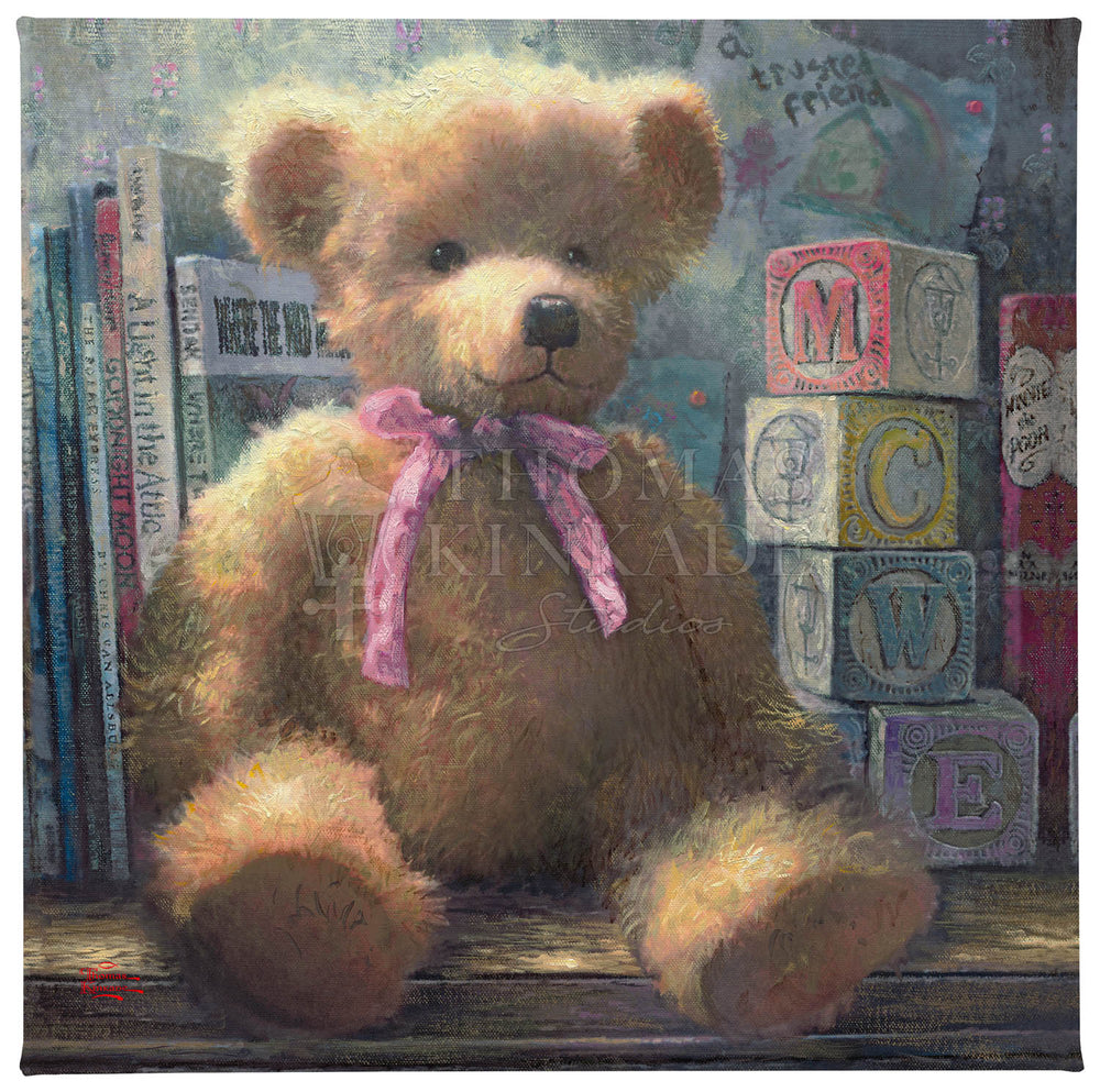 My painting A Trusted Friend celebrates the imagination of childhood which can make even an inanimate object come to life with love. This is my first ever teddy bear painting, and as I worked on it I was reminded of the passion displayed by teddy bear collectors worldwide. These collectors remind us that even for adults a teddy bear can be A Trusted Friend, and perhaps my painting will be a daily reminder of this happy fact. I even added a special touch: you can have your choice of a pink ribbon for girl bears or a blue one for boy bears. That way, your very own "trusted friend" can be even more personal to you!
