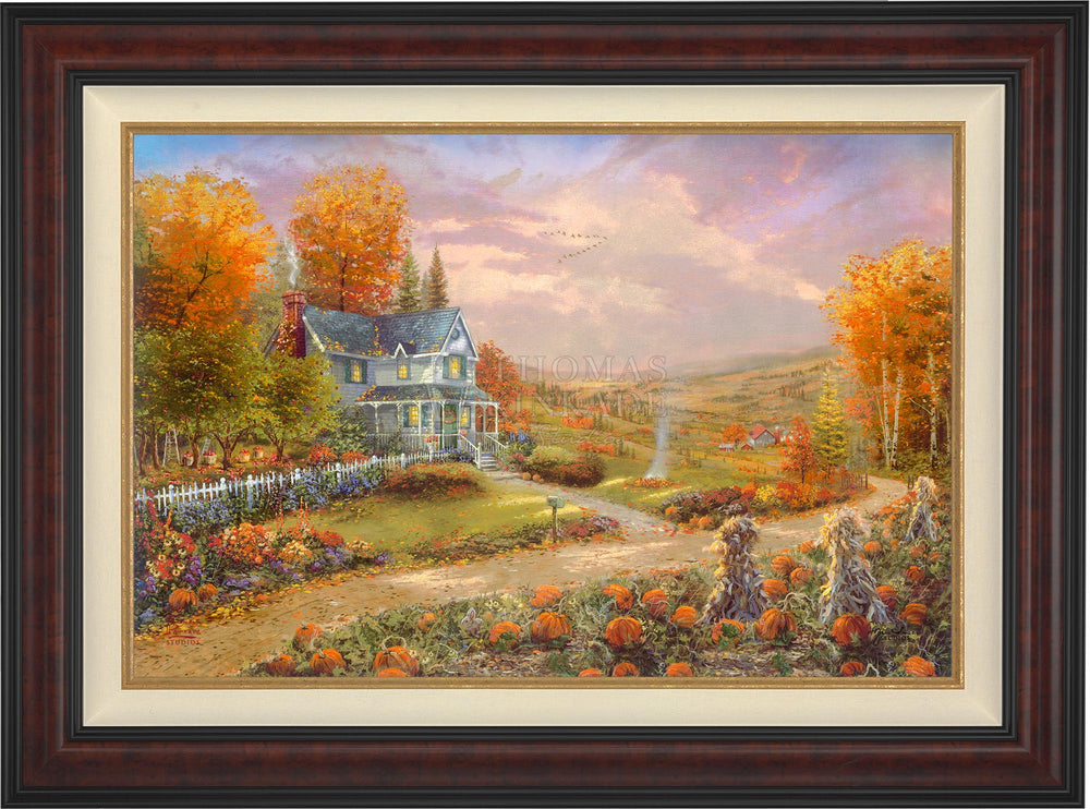 Step foot into a crisp autumn evening at Apple Hill. The light fall breeze, coupled with the bountiful harvest of pumpkins and colorful mums lining the pathway inspire feelings of serenity and comfort, only found on a tranquil Autumn evening. As the sun sets, brilliant colors of gold, scarlet, lavender, and blue paint the sky and reflect upon the transforming landscape and foliage. Autumn memories of picking apples from the trees and walking through the pumpkin patch looking for just the right pumpkin are captured in Autumn at Apple Hill .