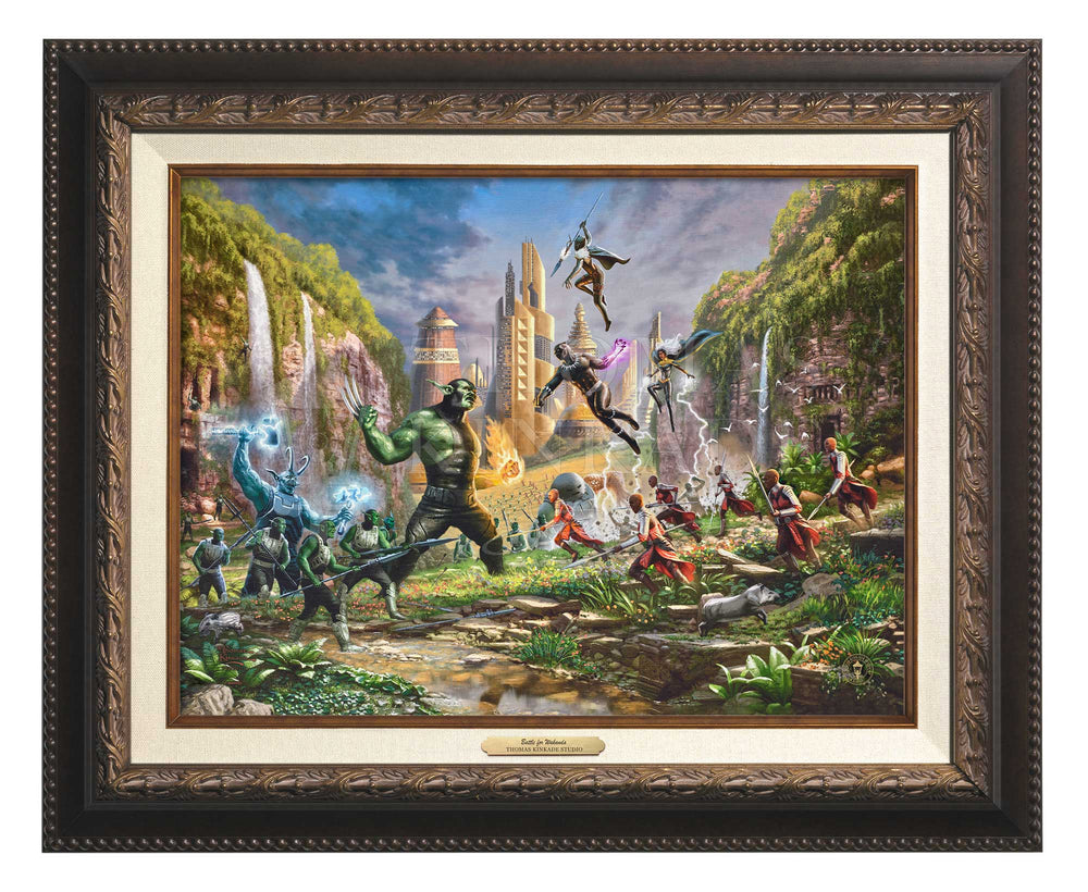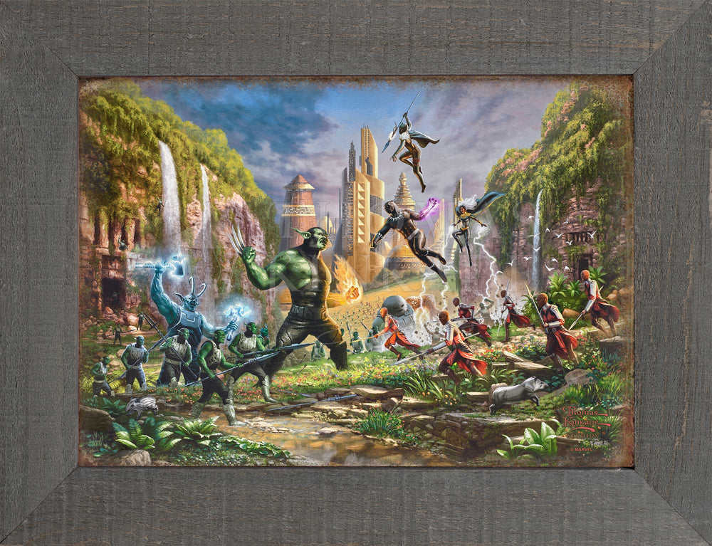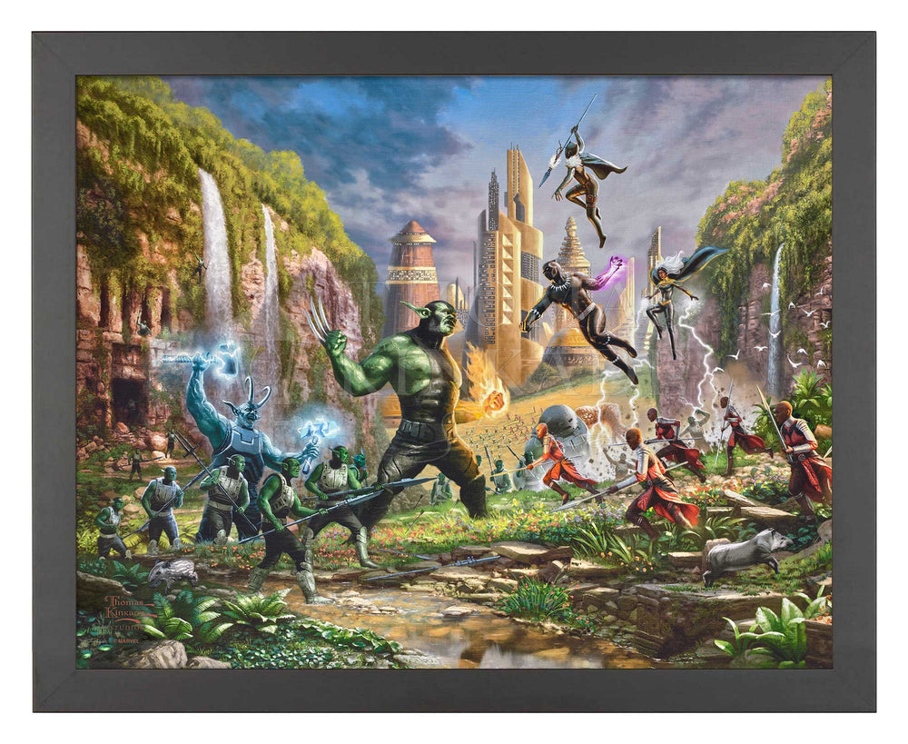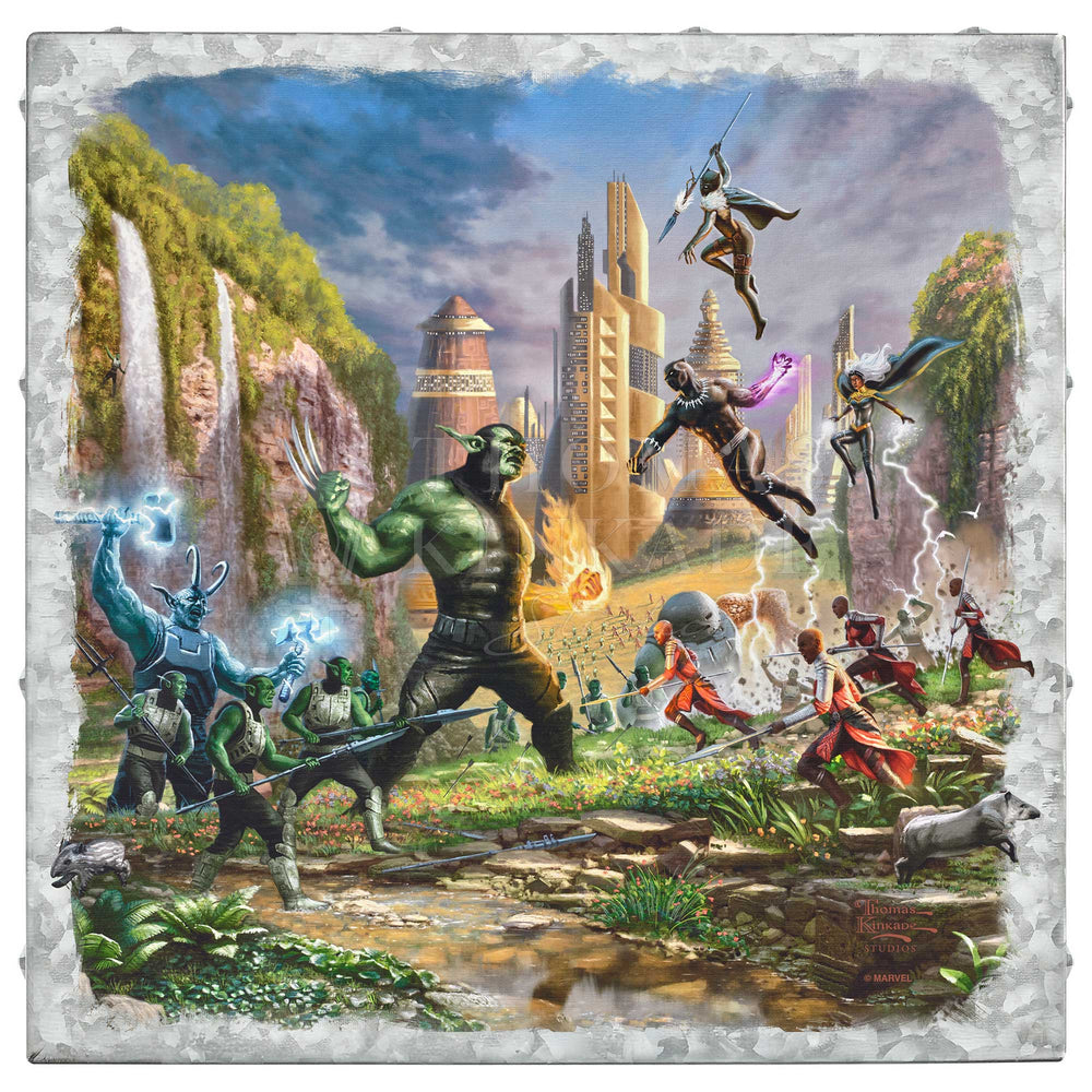 Faced with staggering odds against his beloved nation, Black Panther must rally his allies to defeat the Skrulls and secure the safety of Wakanda and his people. Thomas Kinkade Studios proudly presents its new Marvel Comics collaboration: Battle for Wakanda .