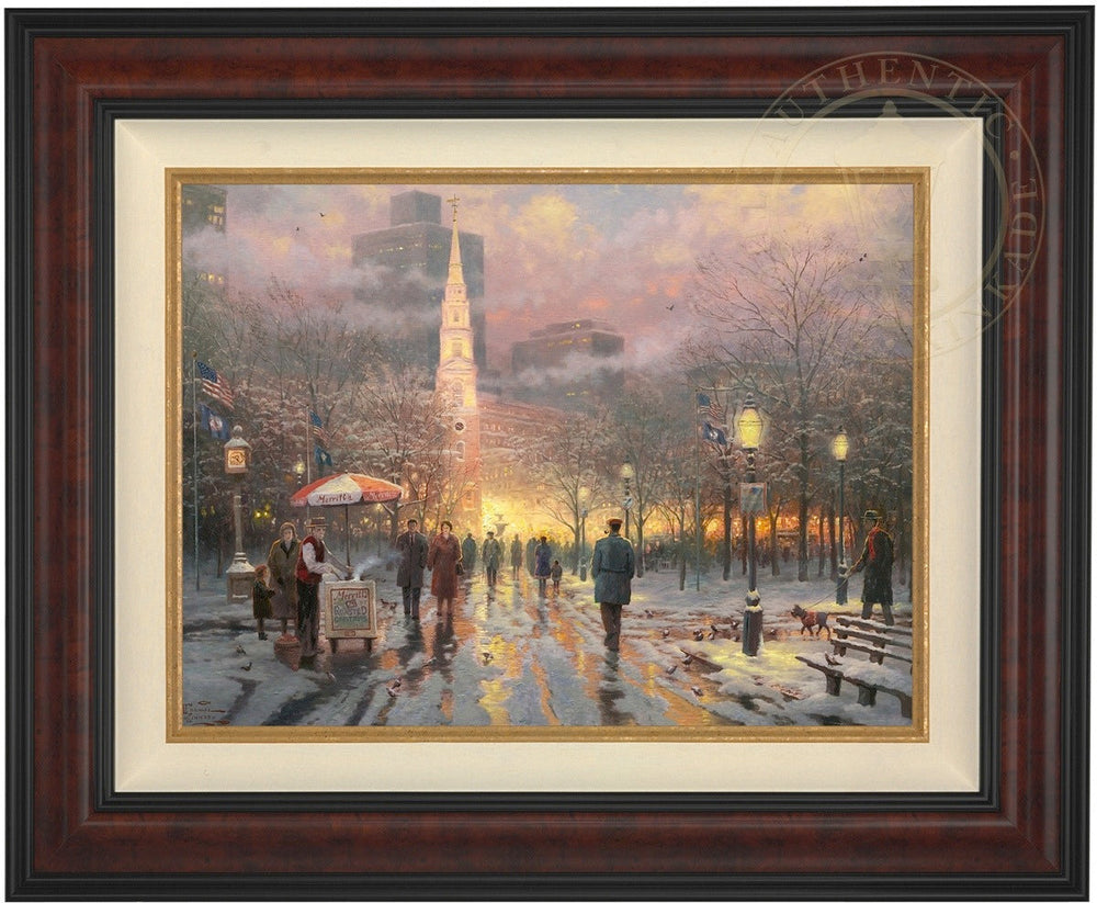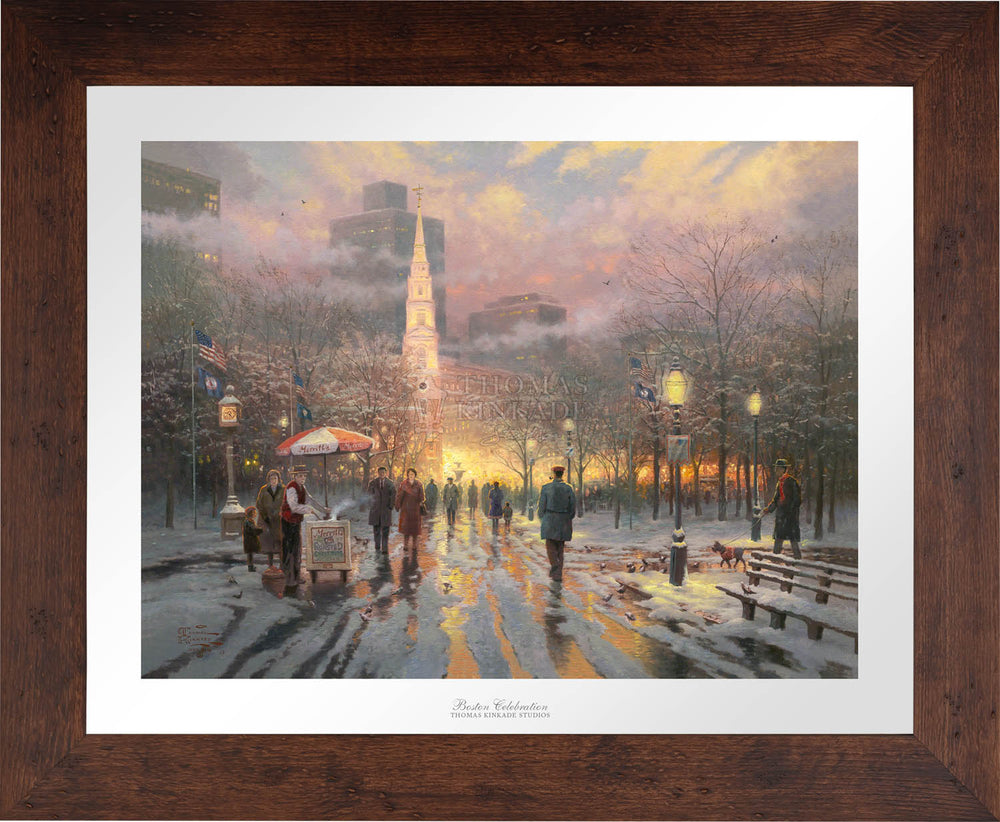 In Boston Celebration I return to a favorite subject at a different time of day and year. I first painted historic Boston Commons fourteen years ago on a damp fall afternoon. Now, I follow that collector favorite with Boston Celebration, meant to evoke the thrilling days following the Patriot's 2005 Super Bowl triumph which came on the heels of the curse-breaking Red Sox World Series. Flags celebrating the champions festoon the square; blazing lights seem to herald the exciting moment; the glowing facade of Park Street Church looms like a victory torch.