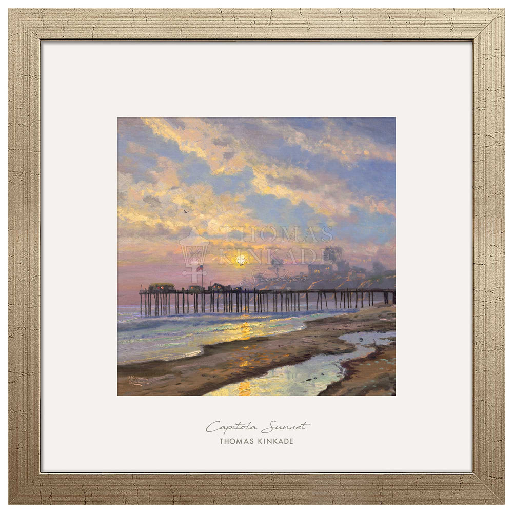 The serene seaside village of Capitola, just north of Monterey has become a favorite weekend retreat for the Kinkade family. Recently, I set up my easel under a beach umbrella and began to paint. The ancient wooden pier becomes the centerpiece of luminous ocean waters painted gold by the setting sun; tidal pools become silvery mirrors reflecting the glory of this Capitola Sunset. My family dined in comfort that evening at the intriguing octagonal restaurant as I put the finishing touches on my plein-air celebration of our romantic Capitola Sunset hideaway.
