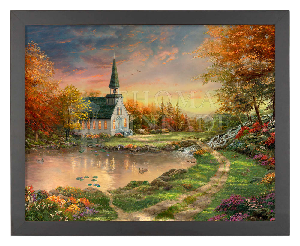 Thomas Kinkade Studios is pleased to present Chapel of Reflection . Carrying on in Thom’s tradition, the Studios created this artwork, portraying a church set in a gorgeous fall landscape to illustrate the hope and beauty that we find in God’s natural presence. The afternoon light casts a soft glow in the sky, as the forest is set alight in autumnal colors. The chapel’s reflection is mirrored in the gentle movement of the water. This painting reminds us that no matter how dark the night, the day will dawn, renewing nature’s tender mercies and rewarding the hopes of the faithful.