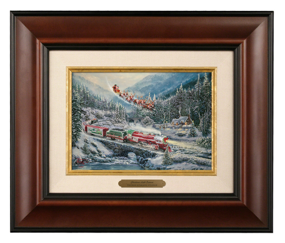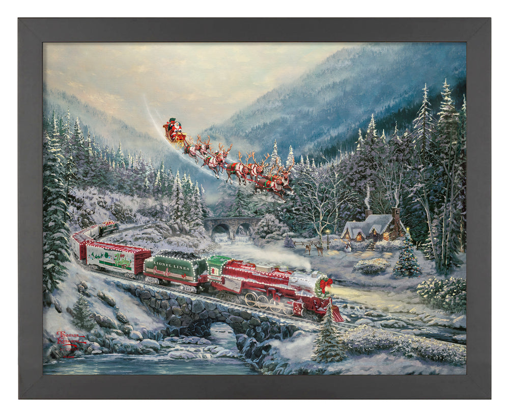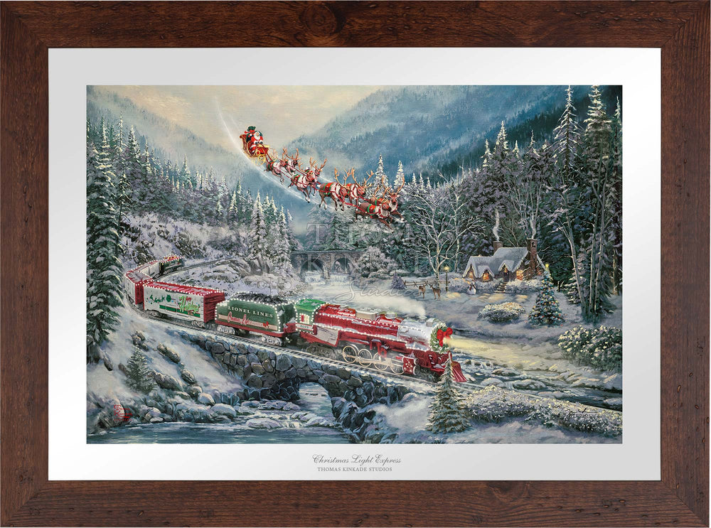 Thomas Kinkade Studios presents, Christmas Light Express, our newest collaboration with Lionel Trains. With this painting we pay tribute to our founder, Thomas Kinkade. Thom grew up in the Sierra Mountains in Northern California with fascination for nature and the world around him. One special Christmas a young Thom was gifted a Lionel train set. Blessed with a wonderful vivid imagination he would dream of faraway places and the adventures in rail travel one might have to reach them.