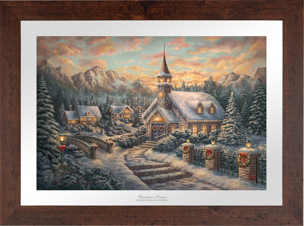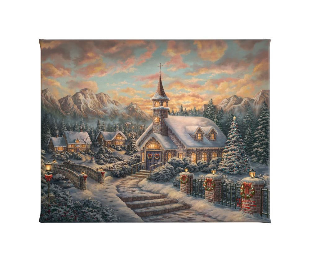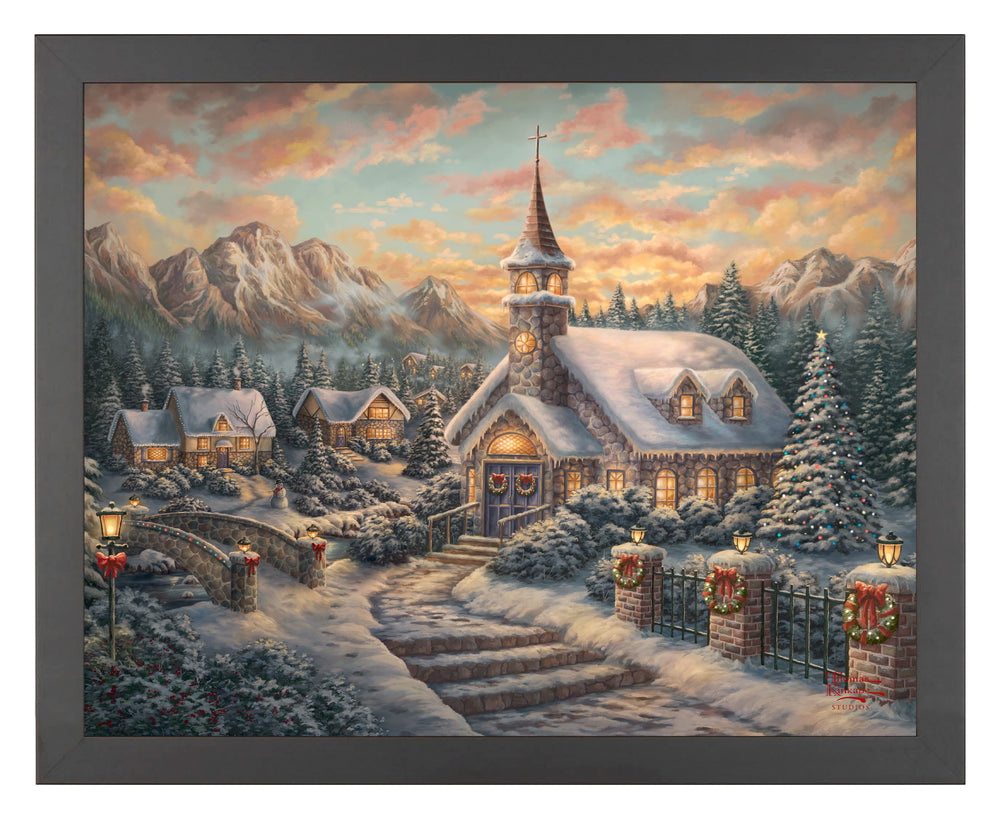 Beneath the mountains, and nestled in a valley, is a quiet village where families have come together over time in friendship and love, and to worship in the quaint church. A warm glow from the sun casts a soft sheen on the shroud of snow that sits gracefully on the ground and highlights the snowman who stands vigil and embodies the very spirit of the season. Join Thomas Kinkade Studios and take a walk through this charming village, and possibly attend a Christmas Service.
