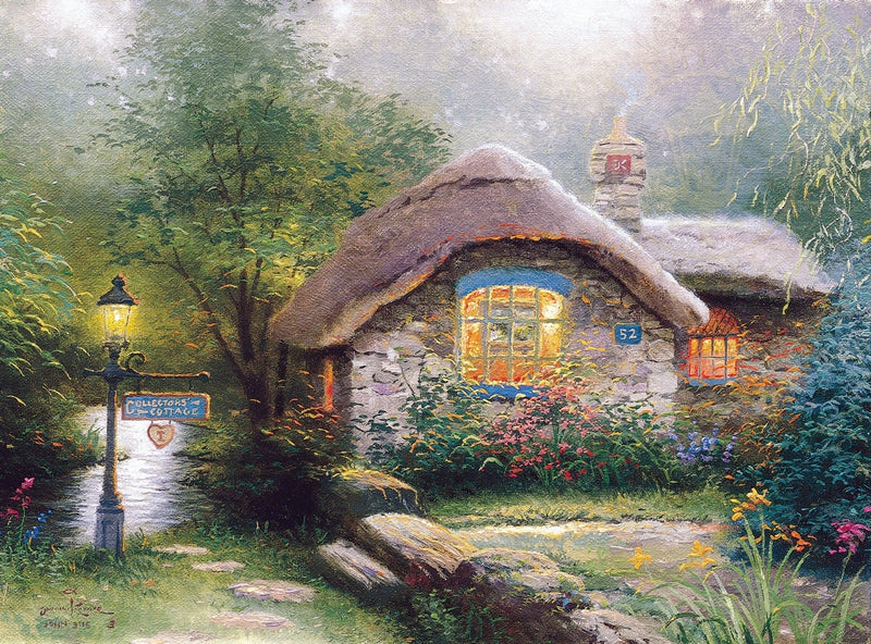 This tiny cottage, nestled beside a stream is based on a real rustic home I discovered in the English Cotswold. To me, it's a perfect place for friends to gather over tea and talk about favorite trips and family gatherings, about art and beauty. In short, the ideal clubhouse for Kinkade collectors!