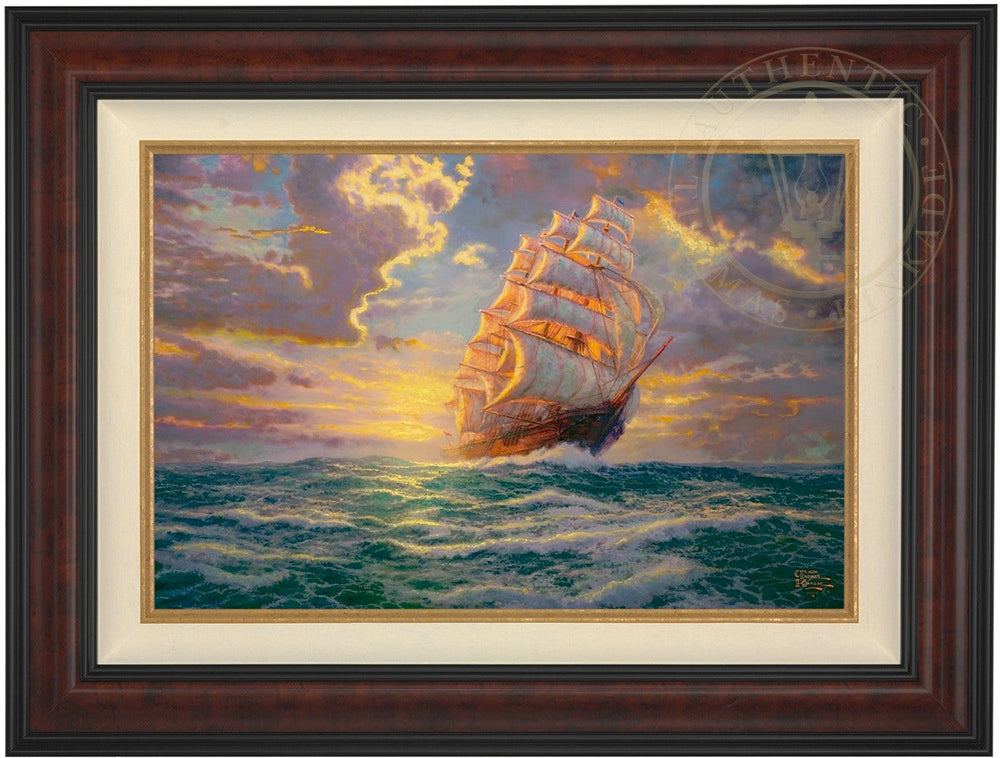 As I set my brush to canvas, I could not envisage a better tribute to courage and hope, than a lone clipper ship defiantly pushing through the ocean's fury against the backdrop of a clearing sky radiant with hope and light. I have always had a great respect for the clipper ship artists of the past for whom the sea represented the only connection to a new world and promises of a new day. Courageous Voyage is as much a tribute to a man like Montague Dawson whose early images of the sea inspired me, as it is a message to those mired in challenge and praying for opportunity and new beginnings. I trust that this image will encourage you to face the swells of life with a profound courage secure in the hope, instilled through providence and faith, that tomorrow is in His hands...that the storm is clearing...that the sun is ushering in a vibrant new day...and that your Courageous Voyage has set you upon the tides of remarkable ventures.