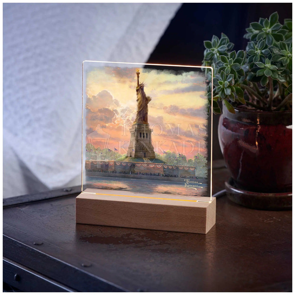 In Dedicated to Liberty , the Thomas Kinkade Studios artists capture those early years of the statue, and the power and majesty behind this great symbol of freedom. Light breaks behind the statue illuminating the freedom that awaits all who come. From its many beauties to its great freedoms, the studio regularly sought to capture the spirit and heart of our great country on canvas. Nowhere is that seen more clearly than in this painting celebrating the symbol of freedom and democracy, the Statue of Liberty. Given to America in 1886 as a gift of friendship from the people of France, the statue greeted arriving immigrants with hopes of a new life in this land of opportunity. Sculpted in copper, the statue's original color has oxidized over decades into the green tones that we know today. Light breaks behind the statue illuminating the freedom that awaits all who come. A ship in the harbor carries families and the dreams of generations. A burgeoning city filled with opportunities awaits.