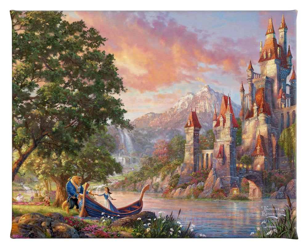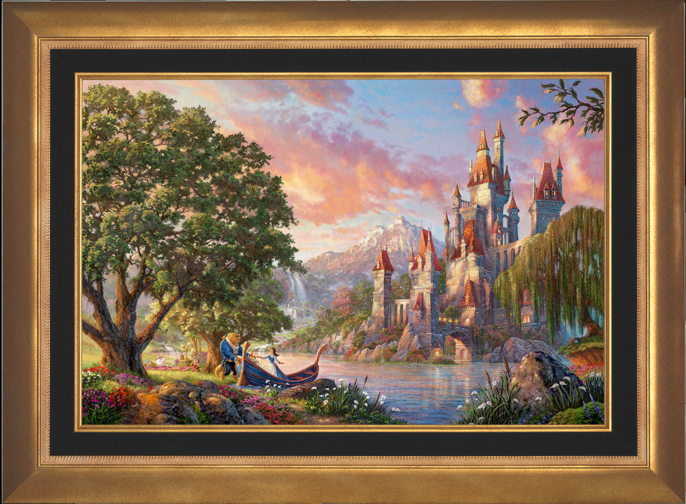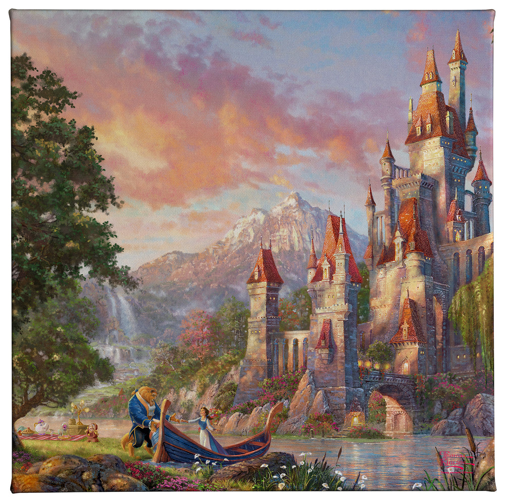 In Beauty and the Beast II , Thomas Kinkade envisioned a breath-taking romantic surprise. Beast has secretly planned a special afternoon for the one he is falling in love with, Belle. Lumiere, Cogsworth, Mrs. Potts and Chip, have all gone ahead to arrange a romantic picnic in a beautiful lakeside meadow with a majestic view of the castle and surrounding mountains. As Belle and the Beast step ashore, the possibilities of love and romance are in the air. Will Belle fall for the Beast? Will Beast open his heart and believe he has found someone who will love him? Will the two of them be surprised by love?