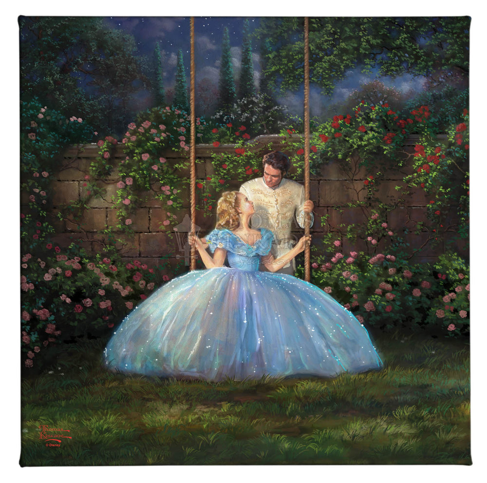 This romantic image inspired by the Disney live action movie, Cinderella , captures the true love that Ella and the Prince have found in one another. After spending an enchanting evening together at the royal ball, they are alone for the first time. A beautiful conversation leads them to realize they have found what their hearts have been longing for. The story of "Cinderella" is a timeless and universal tale of romance and self-discovery. It explores the importance of inner beauty in the assessment of personal worth and proclaims the power of true love to overcome all obstacles no matter how large and daunting they may seem. The folklore of the hidden princess magically discovered by her true prince has been told for hundreds of years in countries throughout the world as geographically and culturally diverse as Malaysia and Germany. The beauty of the fable and the importance of its message have also made it a constant in the list of favorite stories told and enjoyed by those spinning yarns in our own country. To be sure, Thom loved the original "Cinderella" as much as any and would speak of it fondly when reminiscing of story-times spent with his own beautiful daughters. Their laughter and delight at his telling would shine in his own eyes as he reveled in their obvious enchantment. We at the Thomas Kinkade Studios are excited to continue in this storytelling tradition, bringing to life the latest Disney retelling of this classic story in the form of four paintings; each capturing in oil the joy of first love, the wonderment of fairy magic and the excitement of romantic adventure. Whether you are enjoying the encounter with the dashing stranger in the woods, the depiction of Cinderella's enchanted transformation, her flight from discovery at the King's ball or her time in love with the prince of her dreams, all of these masterworks in color and light will dazzle your eye and speak to your heart. It is our hope that this latest interpretation of "Cinderella" be a gift not only to all "princesses" but also to all those who love them.
