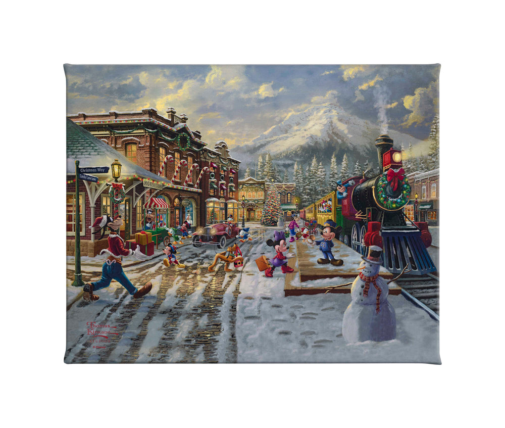 Thomas Kinkade Studios presents Disney - Mickey and Minnie Candy Cane Express . The holiday lights sparkle and twinkle, and brilliant white snow glistens as some of our favorite Disney friends prepare to embark on a festive journey aboard the Candy Cane Express. Mickey Mouse the Train Conductor warmly greets Minnie Mouse as she prepares to board the Candy Cane Express, and Pluto carries the gift bag for her. Scrooge looks on as Huey hurries over to help Dewey bring hot chocolate to Louie, Uncle Donald Duck and Daisy Duck. Goofy strolls toward the platform to board the train, carefully carrying wrapped packages across the snow. Morty runs over to help Goofy with plans to be paid with one of the candy canes in Goofy’s back pocket.