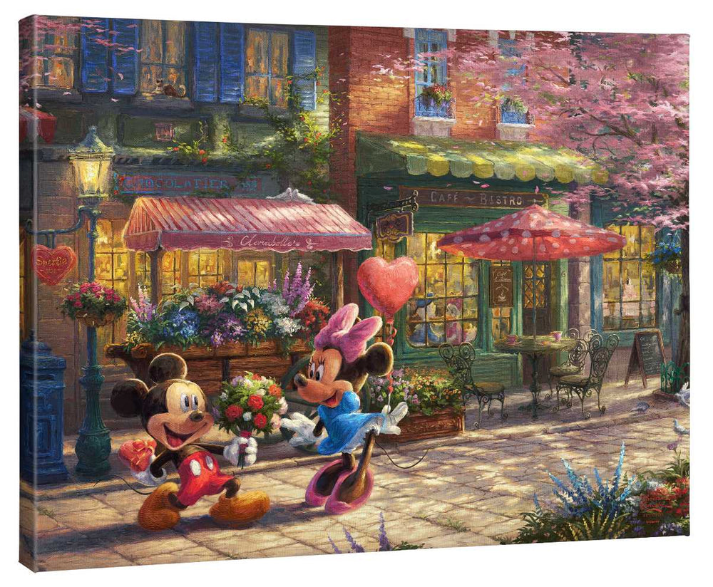 In this gorgeous spring setting, Mickey Mouse presents Minnie Mouse with tokens of his affection – flowers, chocolates and a heart-shaped balloon. Romance is in the air as the pair enjoy an afternoon at their favorite sidewalk café. Dogwoods are in bloom, colorful flower boxes line the cobblestone lane, and love birds perch peacefully above the pair. Minnie Mouse glows with joy, deeply touched by Mickey Mouse's gifts.