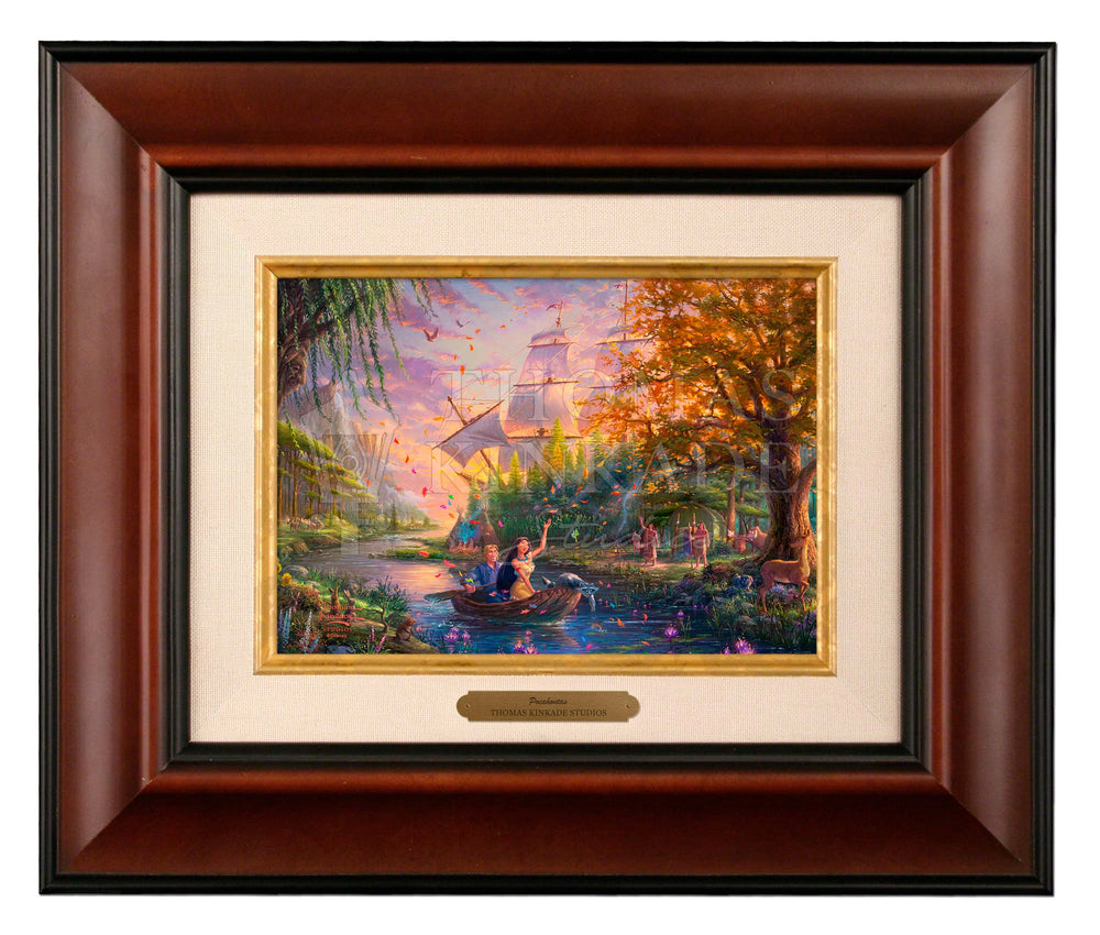 As the evening sun retreats beyond the ship, Susan Constant , and the horizon, a new connection is forming between two distant worlds. The artists at Thomas Kinkade Studios have brilliantly captured one of Disney’s most successful box office hits in one scene entitled, “Pocahontas.” Immersed in traditional Kinkadian light reflecting off the water and illuminating the entire scene, many of the animated characters from the movie are scattered throughout this narrative panorama. The extraordinary life and indomitable spirit of a truly remarkable Native American heroine is celebrated through the artistry and storytelling magic of this painting. “Pocahontas” is a compelling tale of a brave, compassionate young woman who loves nature and "listens with her heart" to help her choose which path to follow. KEY POINTS