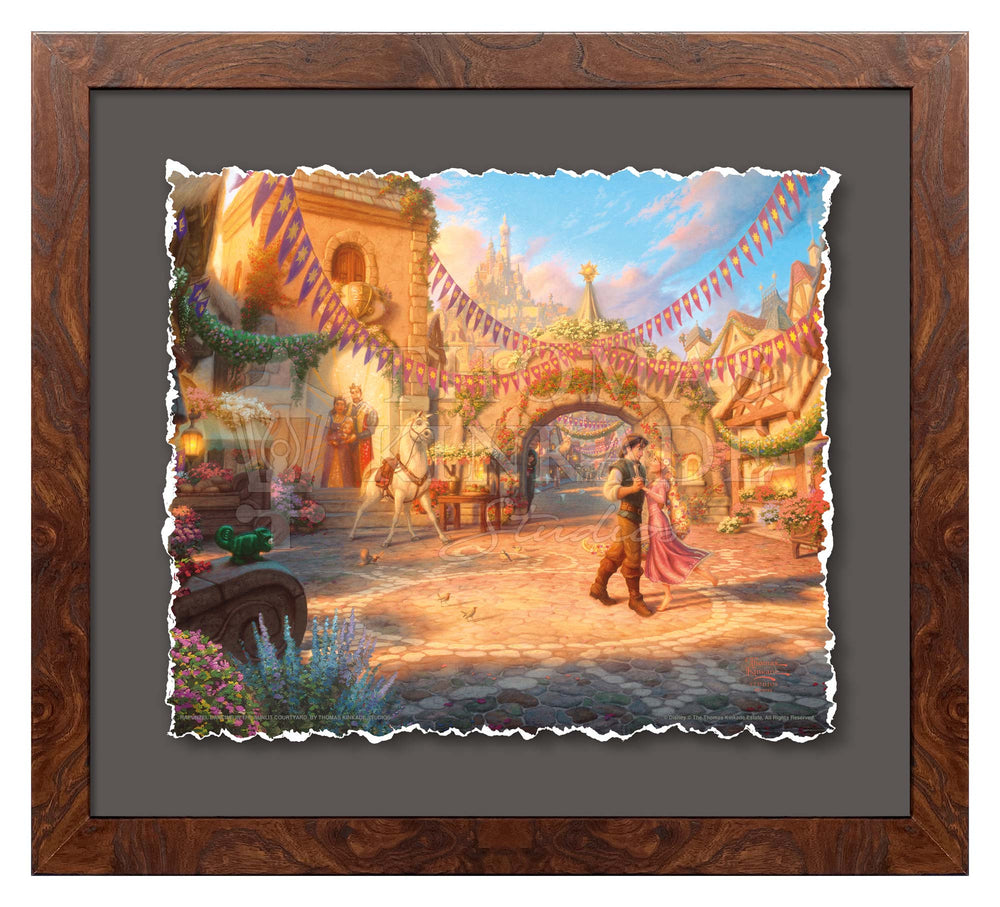 Tangled is a re-telling of the traditional fairy tale “Rapunzel” and joins other great titles as the 50th feature film from Walt Disney Animation Studios. It is with great pride that the Thomas Kinkade Studios presents Rapunzel Dancing in the Sunlit Courtyard. The day is bright with vibrant sunshine, which seems to glisten and sparkle on the stones and flowers. Flynn is looking deeply into the eyes of Rapunzel as he twirls her around the courtyard. Maximus and Pascal seem anxious to join in the dance with the pair. Happiness abounds all around them, and even Mother Gothel, peering around the stone portico, won’t dampen everyone’s joy. Today and each beautiful day they share together will undoubtedly be their “Best Day Ever”.