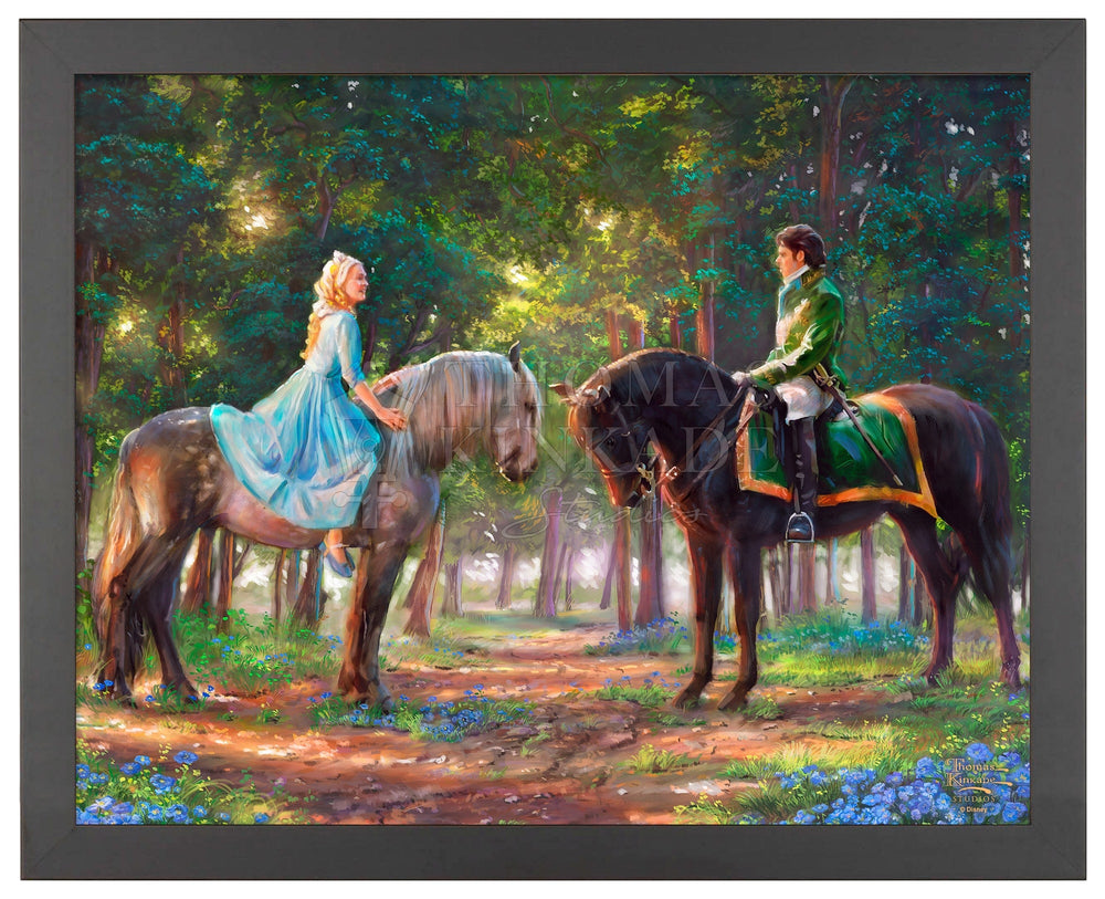 This painting depicts a pivotal scene from Disney’s live-action movie, Cinderella , when Ella meets “The Prince” for the first time. They chance upon each other in the forest as The Prince is on a stag hunt and Ella is on a ride of her own, escaping the distress caused by her stepsisters. This image portrays the instant chemistry between the two. While he doesn't know her name, and she doesn't know he is royalty, their hearts know immediately that they have found someone special, and hope to meet each other again. The story of "Cinderella" is a timeless and universal tale of romance and self-discovery. It explores the importance of inner beauty in the assessment of personal worth and proclaims the power of true love to overcome all obstacles no matter how large and daunting they may seem. The folklore of the hidden princess magically discovered by her true prince has been told for hundreds of years in countries throughout the world as geographically and culturally diverse as Malaysia and Germany. The beauty of the fable and the importance of its message have also made it a constant in the list of favorite stories told and enjoyed by those spinning yarns in our own country. To be sure, Thom loved the original "Cinderella" as much as any and would speak of it fondly when reminiscing of story-times spent with his own beautiful daughters. Their laughter and delight at his telling would shine in his own eyes as he reveled in their obvious enchantment. We at the Thomas Kinkade Studios are excited to continue in this storytelling tradition, bringing to life the latest Disney retelling of this classic story in the form of four paintings; each capturing in oil the joy of first love, the wonderment of fairy magic and the excitement of romantic adventure. Whether you are enjoying the encounter with the dashing stranger in the woods, the depiction of Cinderella's enchanted transformation, her flight from discovery at the King's ball or her time in love with the prince of her dreams, all of these masterworks in color and light will dazzle your eye and speak to your heart. It is our hope that this latest interpretation of "Cinderella" be a gift not only to all "princesses" but also to all those who love them.