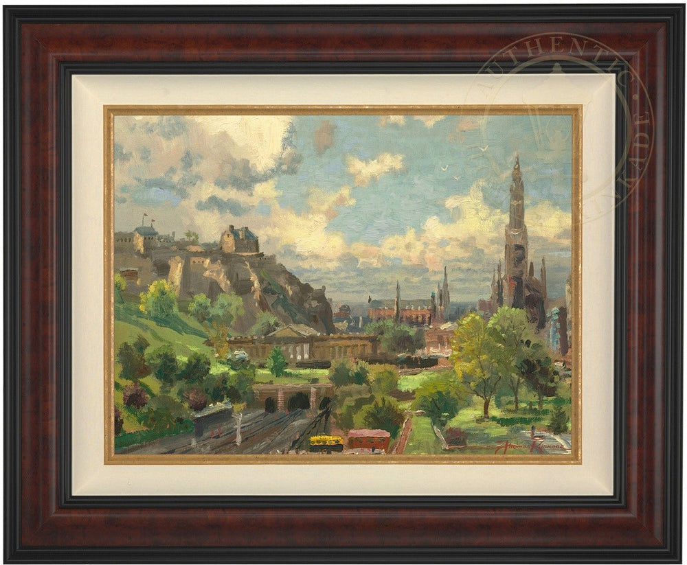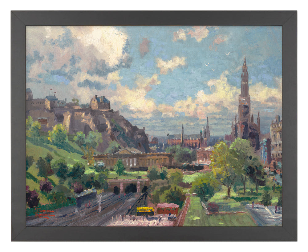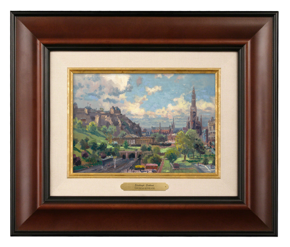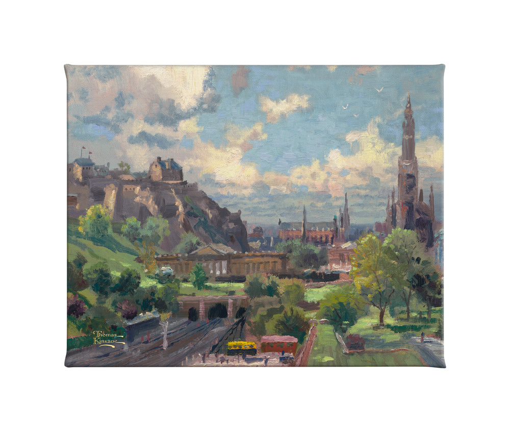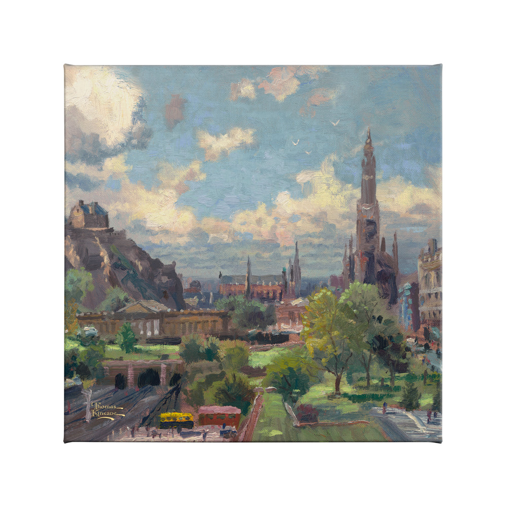The decades-long love affair between the Kinkade family and the British Isles continues with Edinburgh, Scotland, my plein air portrayal of a city of almost magical charm. I've never had so strong a sense of the living Middle Ages as I did when I sat before my easel overlooking Edinburgh's famed Old Town. The towers and turrets of the magnificent castle and the spires of churches contrast with the horizontal sweep of colonnades along the royal mile. The architecture reflects and amplifies the grandeur of the rugged hillsides and the lush, sweeping parkway.
