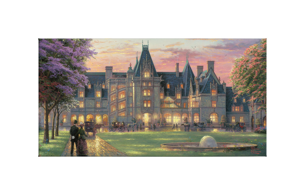 My challenge in painting Elegant Evening at Biltmore ® was not to convey the heroic scale of this fairy-tale castle, but to make it warmly personal. I utilized glittering lights to suggest a festive evening affair in progress. I invite you to climb aboard your elegant coach and join the celebration.
