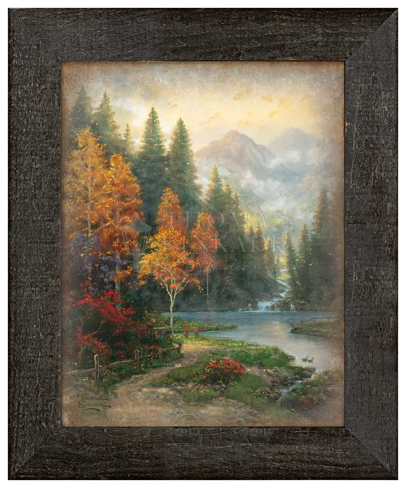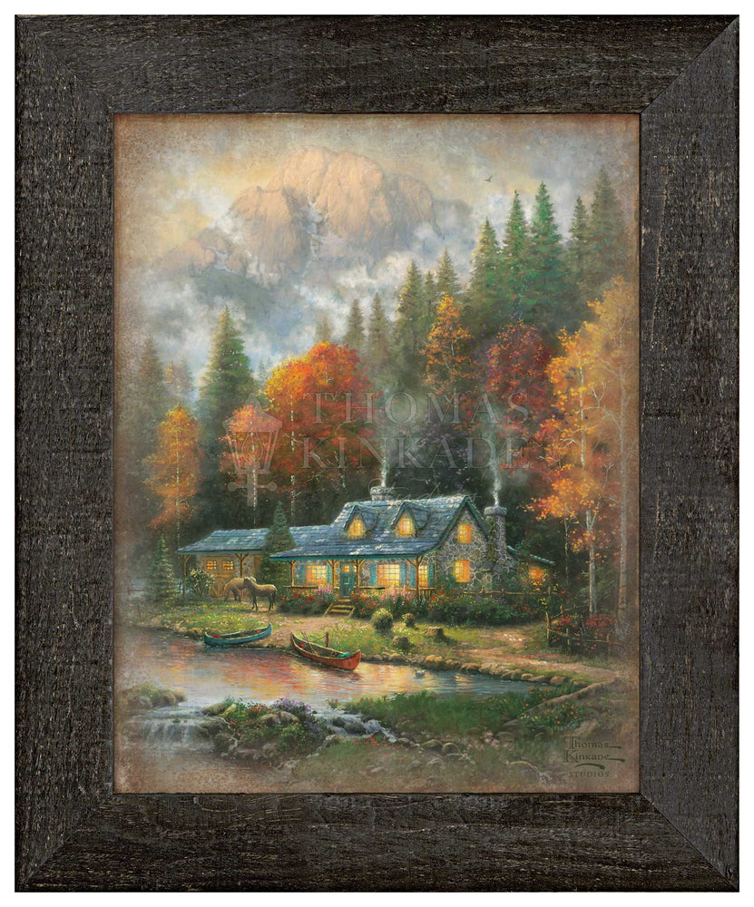 Autumn is a special time of year. When the crisp cold air flows down from the north and the leaves explode into vibrant hues of orange, yellow and red, one gets a sense of time passing, of another year coming to an end. It is the last flash of color before the world falls into winter and the promise of spring's rebirth begins. Evening at Autumn Lak e captures that time of year when the nights become long and the world readies itself for a nap under a snowy blanket. Thomas Kinkade loved this season for the color it provided his palette, but also for the mood it created in the mountains he roamed as a young man. Thom grew up in the Sierra-Nevada's and that majestic range is where he first honed his immense talents as a landscape artist.