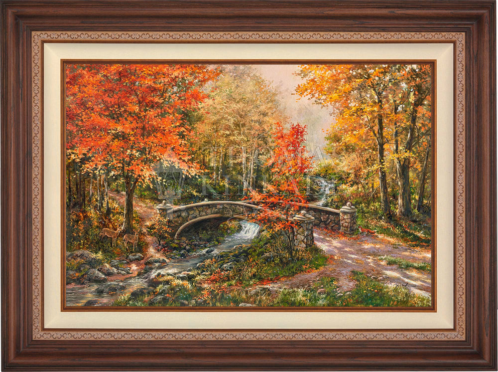 “I find that a country lane is a lovely invitation to my imagination.” – Thomas Kinkade Our founder, Thomas Kinkade, enjoyed numerous countryside rambles over his lifetime, many of which provided inspiration for his art. One of his most memorable walks led to the creation of his iconic Autumn Lane in 1995. If you were to continue down the country lane Thom originally painted, you might find a stone bridge over a beautiful creek that flows with life affirming water. The soft dappled sunlight streams through the colorful autumnal trees highlighting natures wonders and the beauty of the stones in the bridge. A family of deer gracefully move through the countryside on their daily adventure, as butterflies sweetly flitter in the cool fall air. And you may even spot a fox as you pass over the bridge. Thomas Kinkade Studios has followed Thom’s lead to ramble down the country lane and is pleased to present Fall at Fox Creek Bridge . Key Points