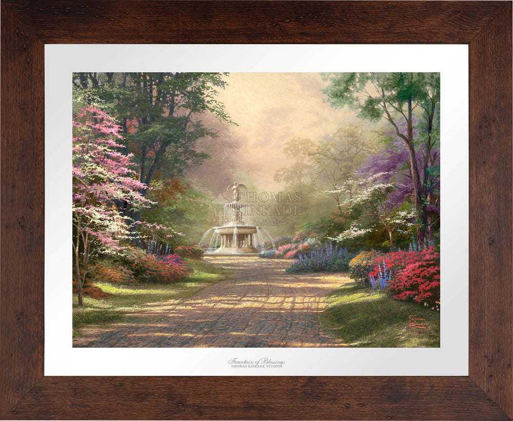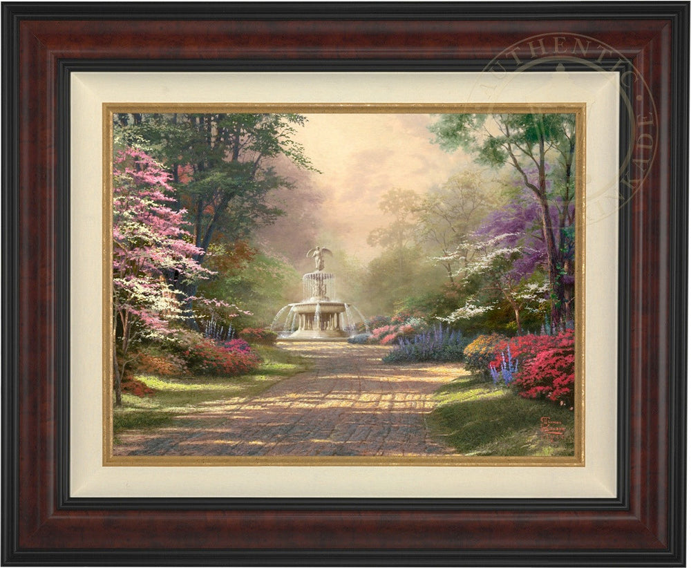 In Fountain of Blessings, the bounty of God's blessing is displayed through an ancient stone fountain discovered in a quiet park Thom had explored. An abundance of color - pink and white dogwoods along with lush azaleas are seen lining the pathway. Reigning over it all is the majestic fountain itself - a stunning monument bubbling forth its' life-giving waters. There an angel rests, symbolizing the blessings from God that await all of us who are willing to receive.