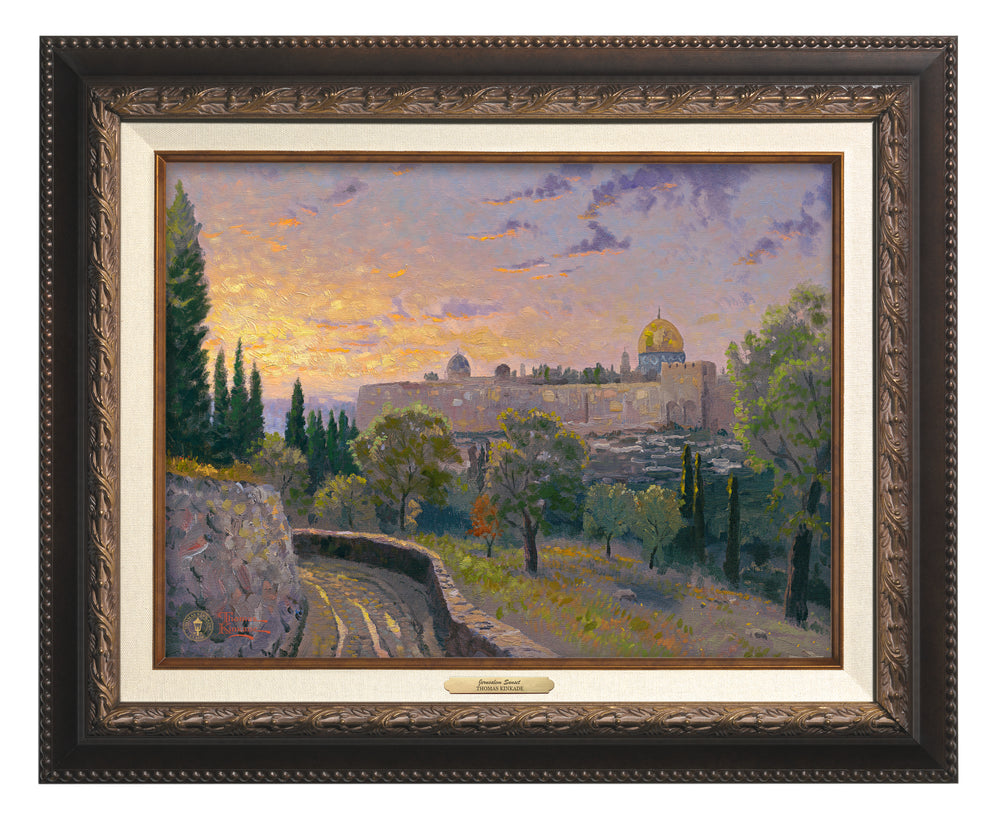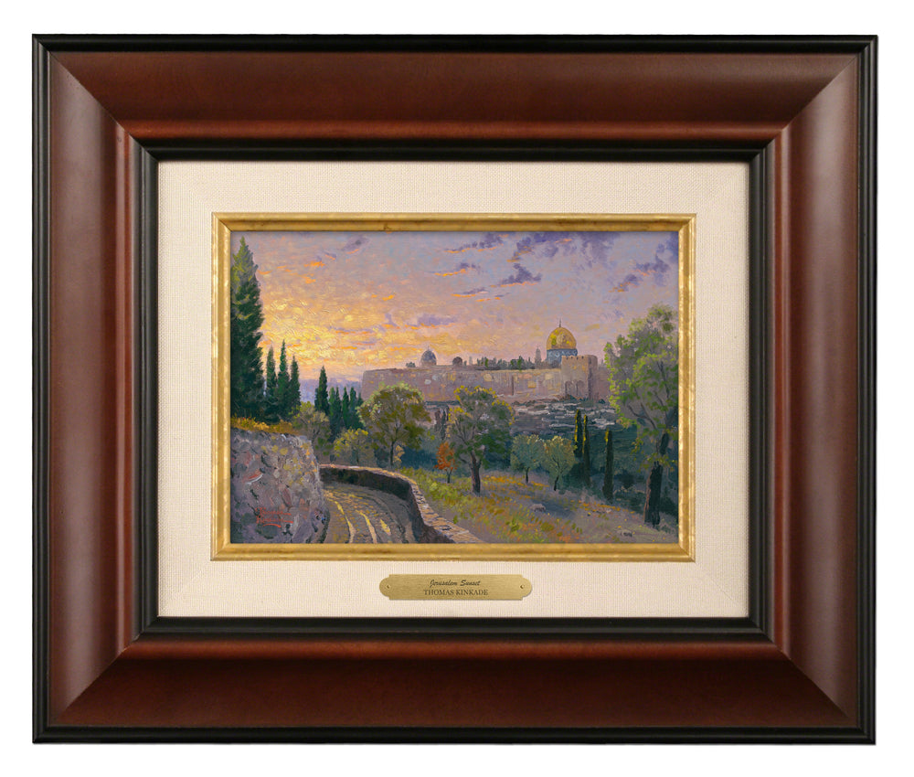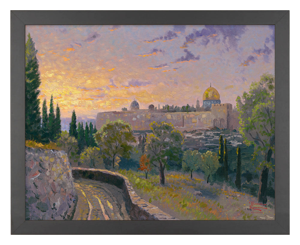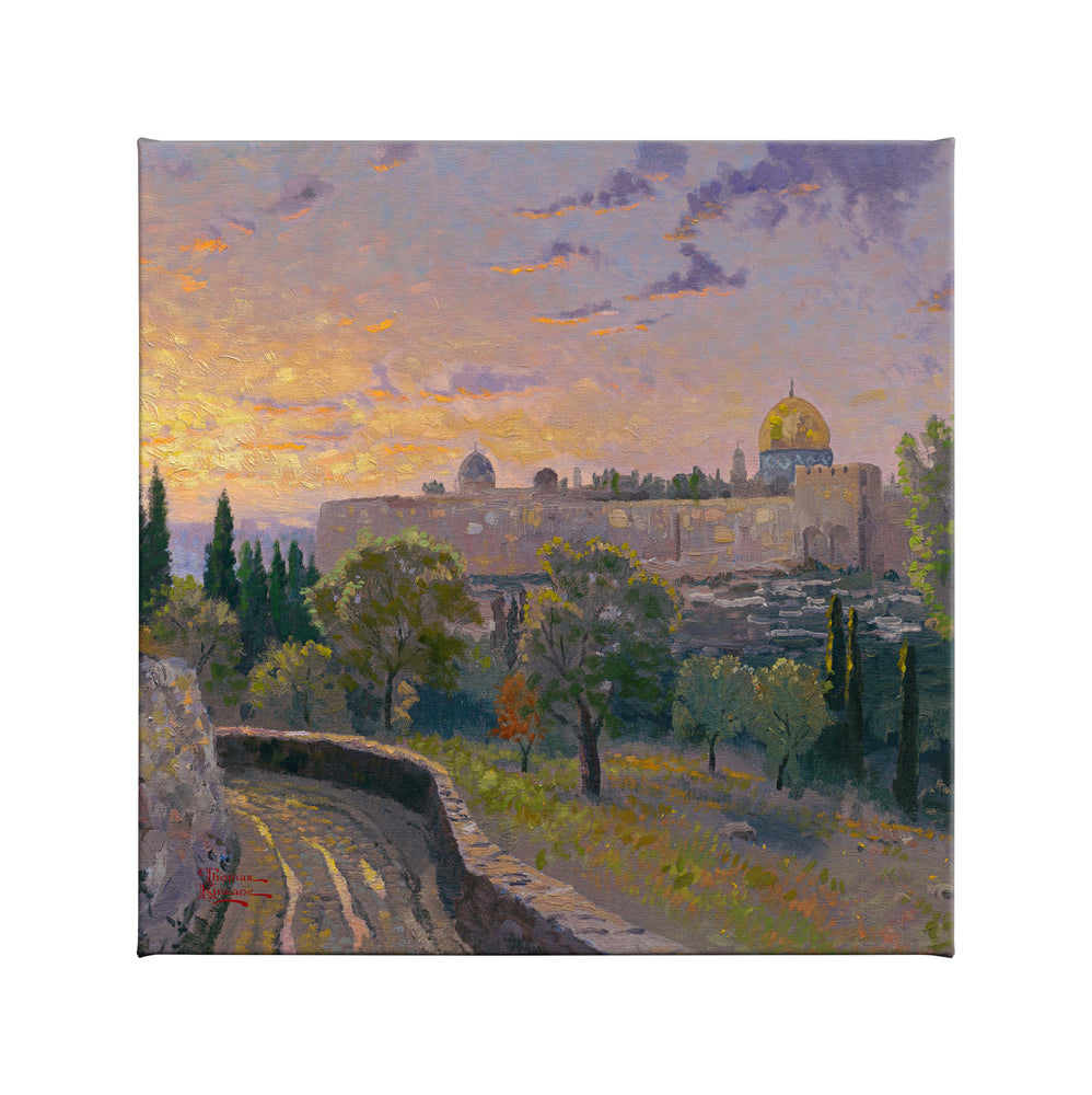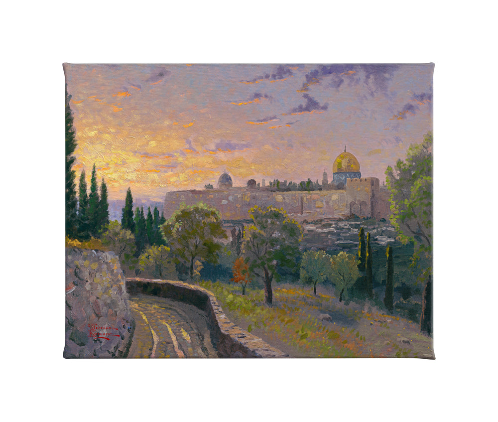 I set up my canvas on holy ground when I painted Jerusalem Sunset, then chased the rapidly setting sun so I could establish the effect of God's presence in this sacred spot. Christ is known to have slept among the ancient trees of the Mount of Olives during the last week of His ministry. The Dome of the Rock, sacred to three religions, is on the left.