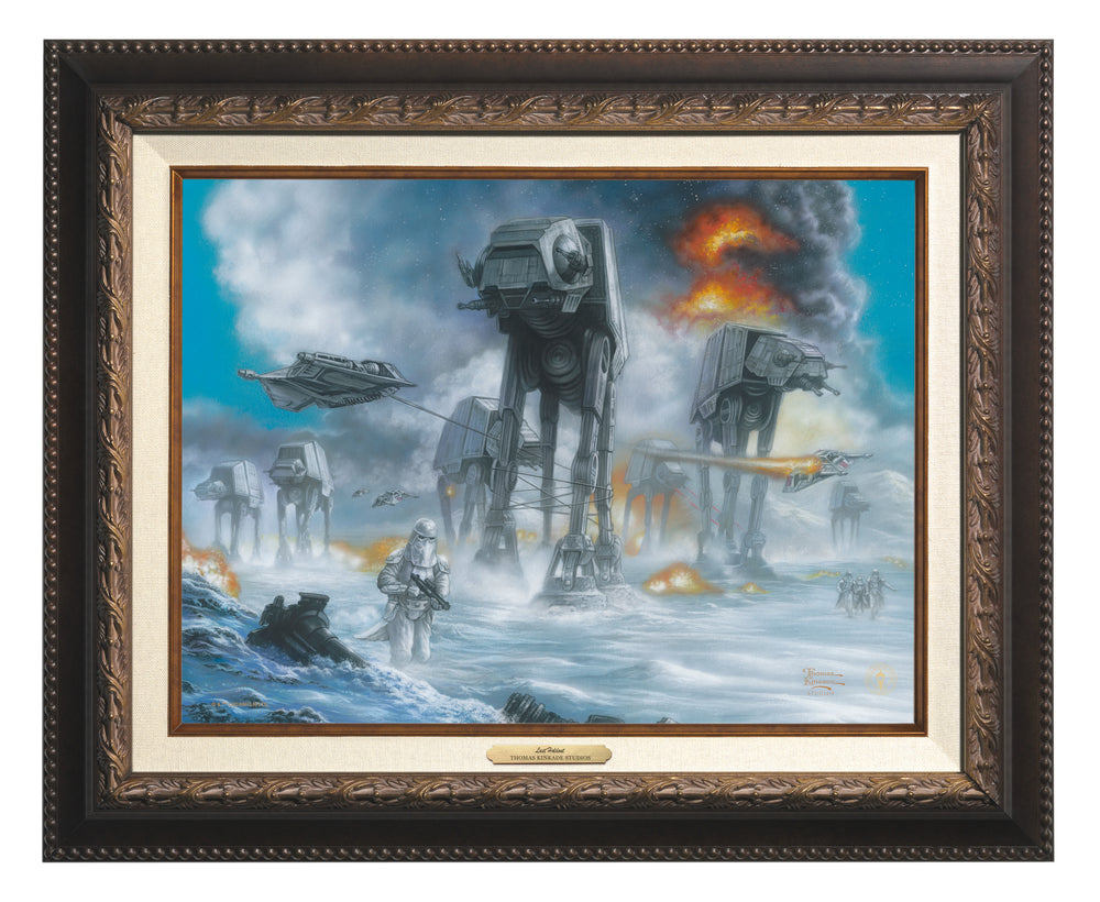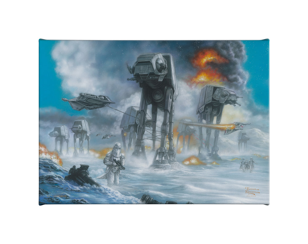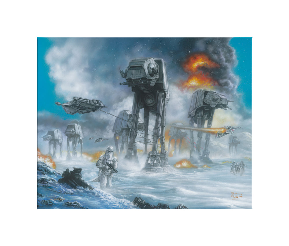 A dramatic depiction of the desperate final moments of the Battle of Hoth as Imperial forces overwhelm the Rebel defenses. The painting captures the iconic battle from Star Wars: The Empire Strikes Back™, showing Imperial AT-AT walkers dominating the snowy landscape. Their imposing mechanical forms tower over the battlefield amid explosions and combat debris. In the foreground, Imperial snowtroopers advance across the icy terrain. Rebel snowspeeders engage the walkers, with one using tow cables to bring down an AT-AT while another fires directly at a walker. The color palette features cold blues and whites of Hoth's frozen landscape, dramatically contrasted with the warm oranges and reds of explosions and blaster fire.
