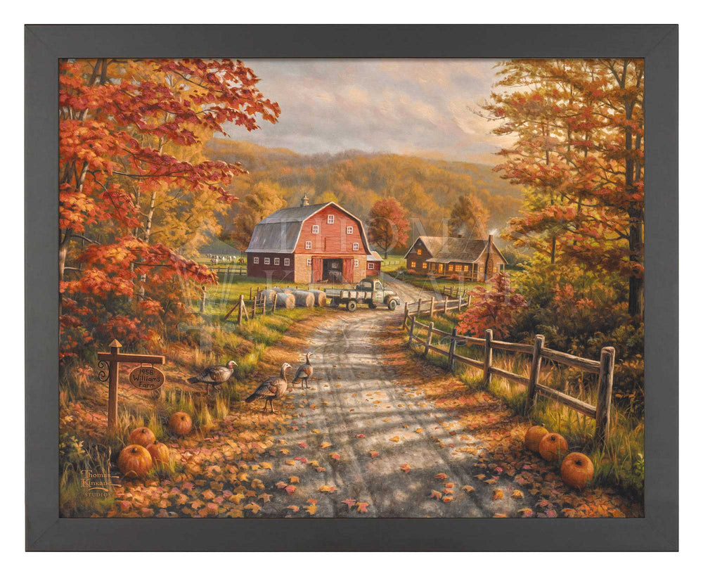 Autumn is one of the most beautiful times of the year. The sun begins to set earlier in the evening, and a brisk breeze rustles the colorful leaves on the trees. In Late Afternoon on the Farm , the artists of Thomas Kinkade Studios explored what lay around the corner in A Walk Down Autumn Lane , and “William’s Farm” appeared nestled serenely in the hills.