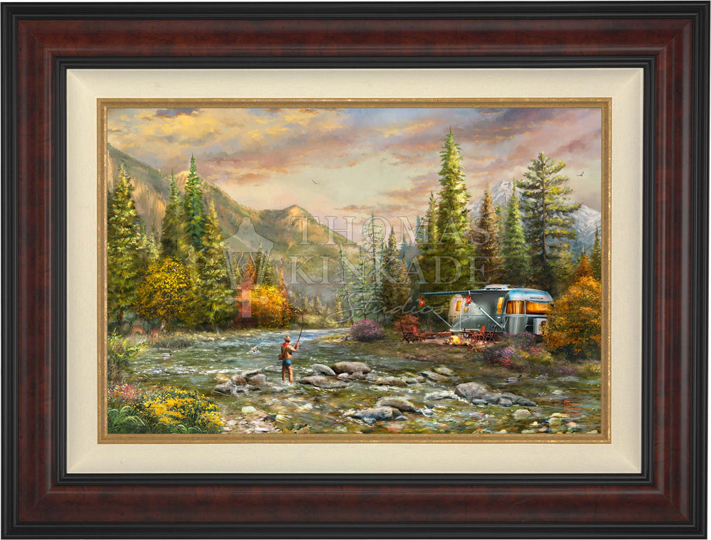 The evening sun has cast a soft warm glow on the rushing river as the fly fisherman is reeling in the last of the days catch. The fish might be putting up a good battle, but it will make a tasty dinner. The fire is lit and ready to warm the fisherman after his long day on the river. Thomas Kinkade Studios asks that you journey with us to find the calm and inner peace one can discover, Living the Dream.