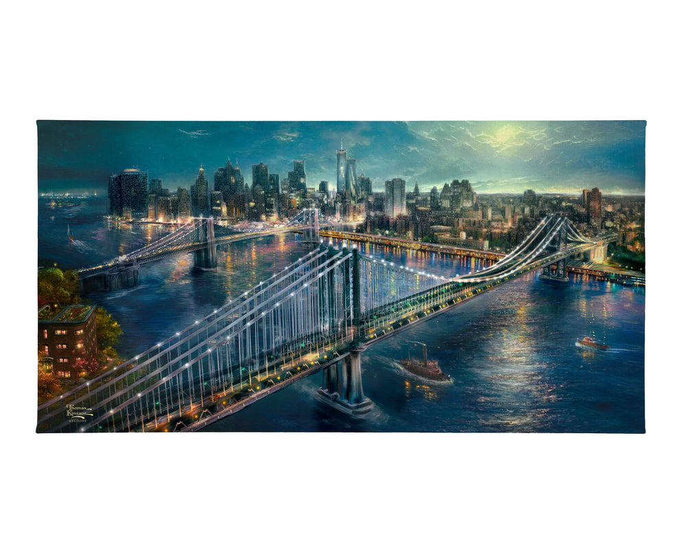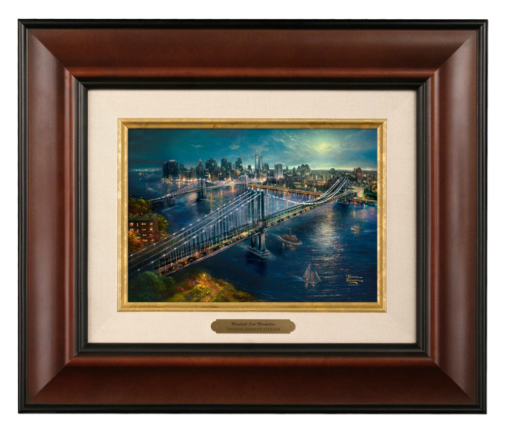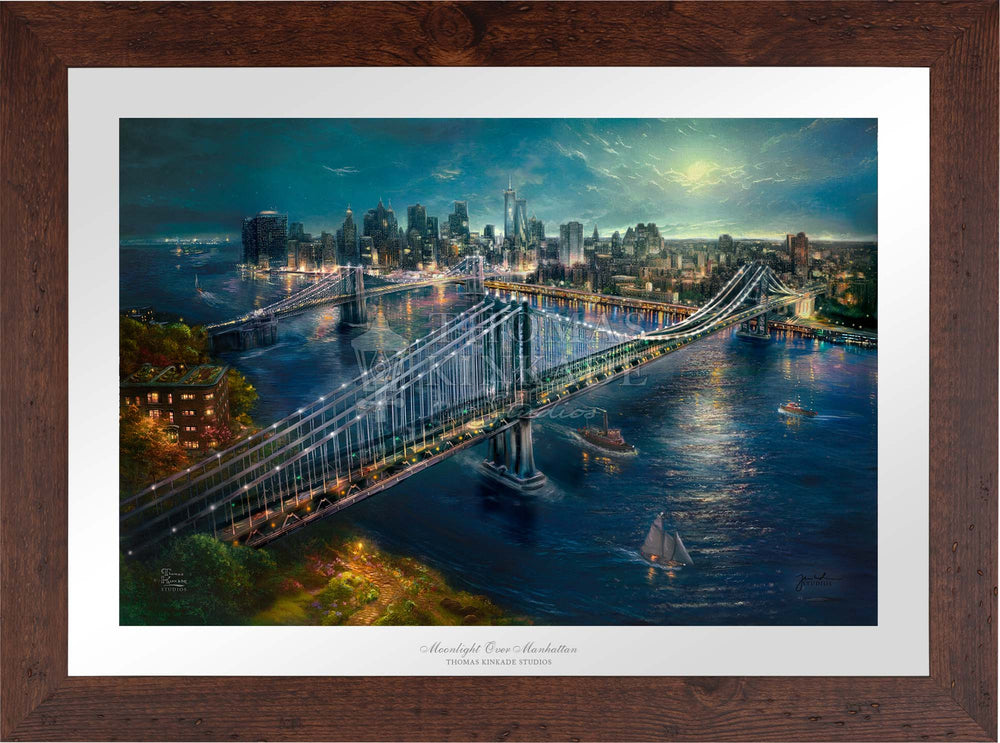 As the moonlight shines brightly over New York City, the skyline twinkles with thousands of little bright lights that mimic the pulsing rhythm of this dynamic city. The traffic on the water, bridges, and shoreline reflect that the heart of this city never stops beating. If one stands still long enough, you may just hear the honk of a car horn, someone yell “taxi” or the horn from the tugboat as it passes underneath the Manhattan Bridge. In the distance, the Statue of Liberty stands guard and holds the torch of freedom high in the night sky. Join Thomas Kinkade Studios and celebrate the magic of this wonderful city in Moonlight over Manhattan .