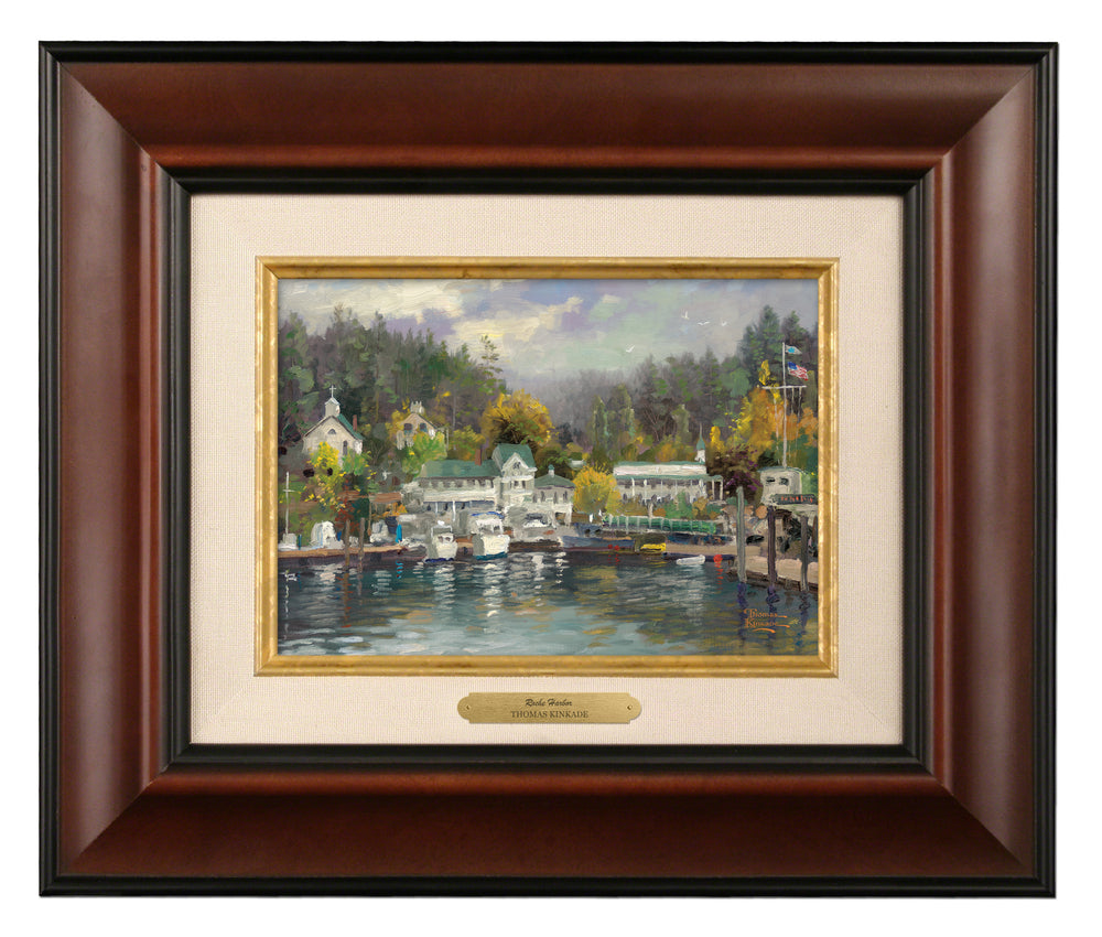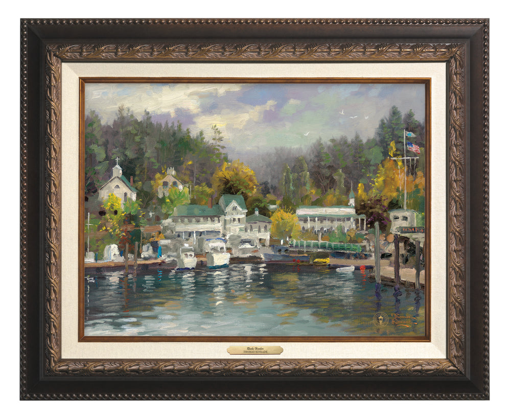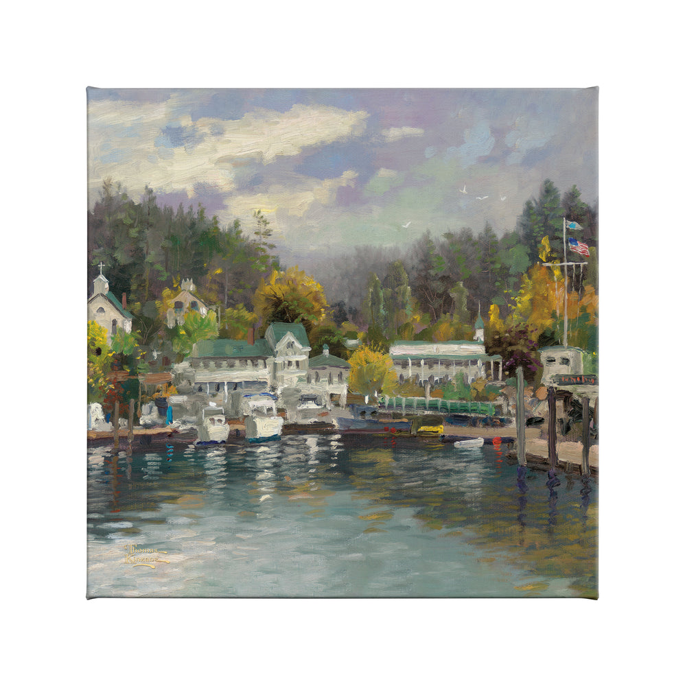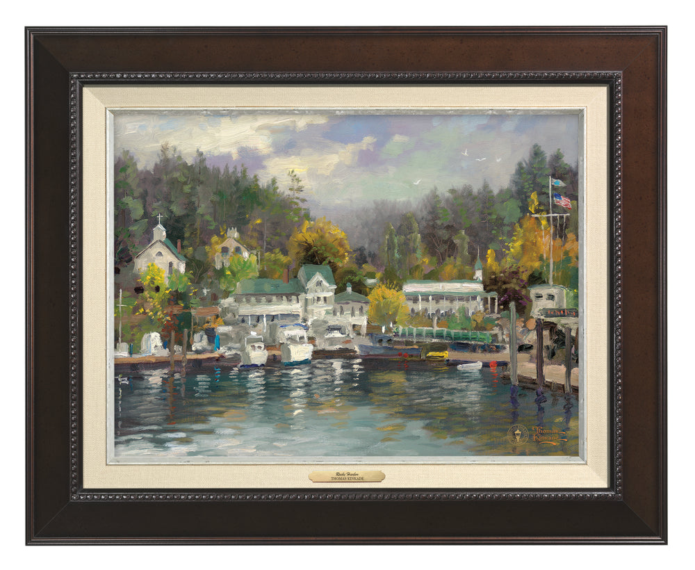 Located on San Juan Island in Washington State, this harbor scene depicts a small town on the waterfront. Thomas Kinkade's fascination for small tucked-away towns, marinas, yachts, and old Victorian homes are featured in this Impressionist piece.