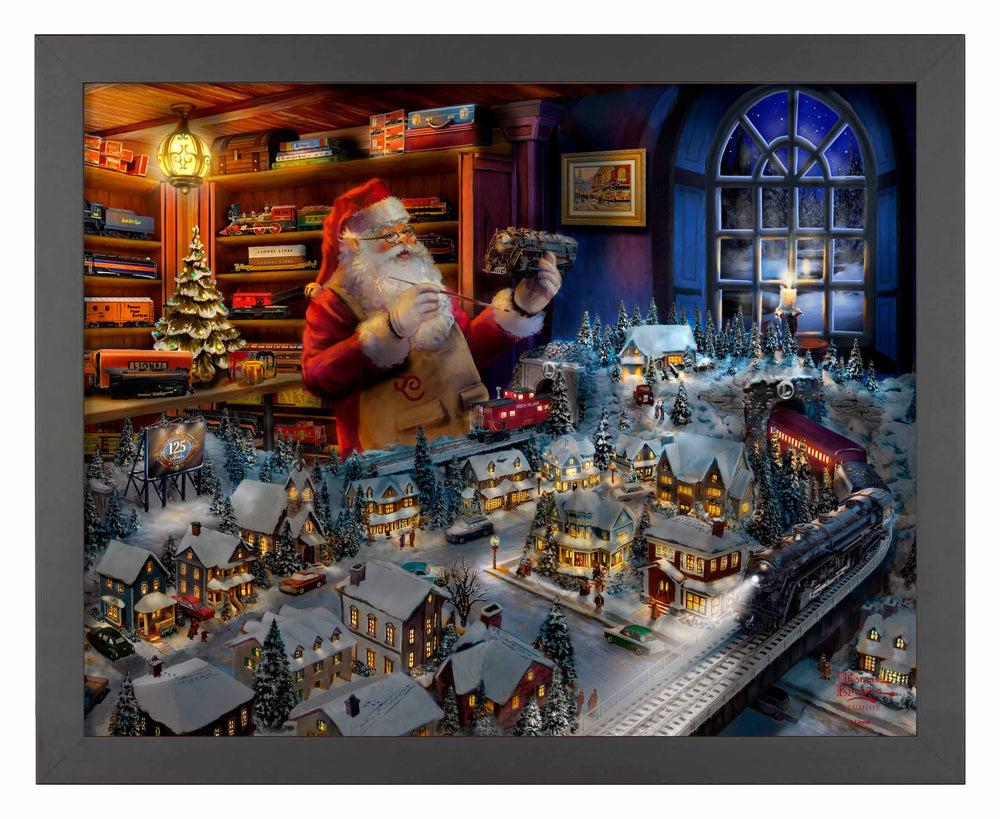Thomas Kinkade Studios presents, Santa’s Final Touch, A Lionel Legacy, our newest collaboration with Lionel Trains that celebrates Lionel’s 125th anniversary. With this painting, we give a glimpse inside one of Santa’s workshops that houses a varied collection of Lionel locomotives and boxcars and an impressive village. We can watch Santa painting, as he applies the final touches to a Lionel 700 E Hudson locomotive engine.