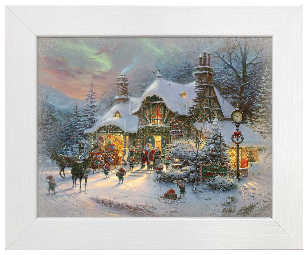 In Santa’s Night Before Christmas by Thomas Kinkade Studios, excitement is in the air as Santa’s elves pack his sleigh with presents to deliver to all the good children of the world. For the entire year, the residents of the North Pole have been joyfully working around the clock to get ready for Christmas Eve. As the time for departure approaches, the brilliant northern lights have lit up the sky with a dazzling display of auroral light; creating the perfect scene to start Santa’s magical journey.