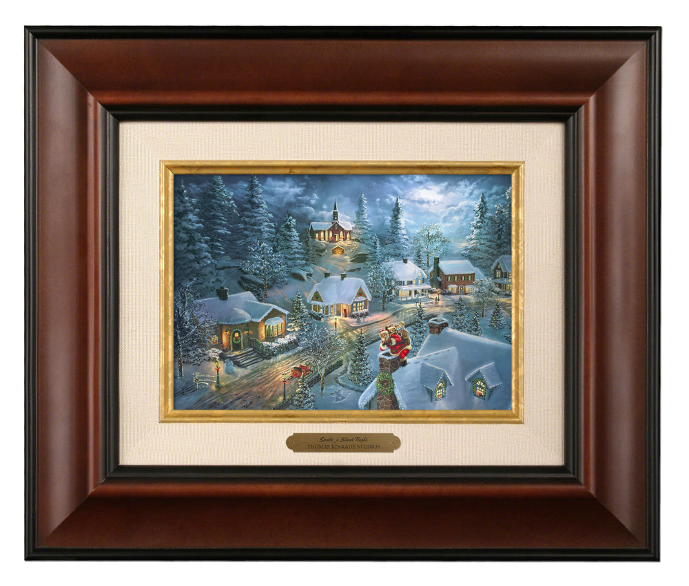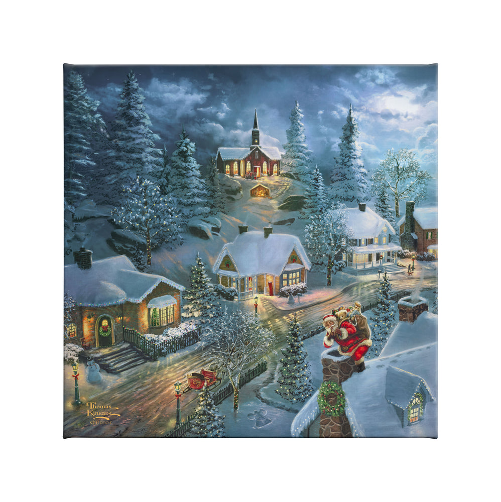 Santa's Christmas Eve voyage is a tale young and old love to hear over and over again. On this crisp winters' night, Santa and his sleigh have quietly landed so he can make his special deliveries. The harmonious notes of the choral choir drift down from the hilltop church on chilly winter air, as Santa travels from home to home. Join Thomas Kinkade Studios and sleep sweet dreams of Santa's Silent Night.