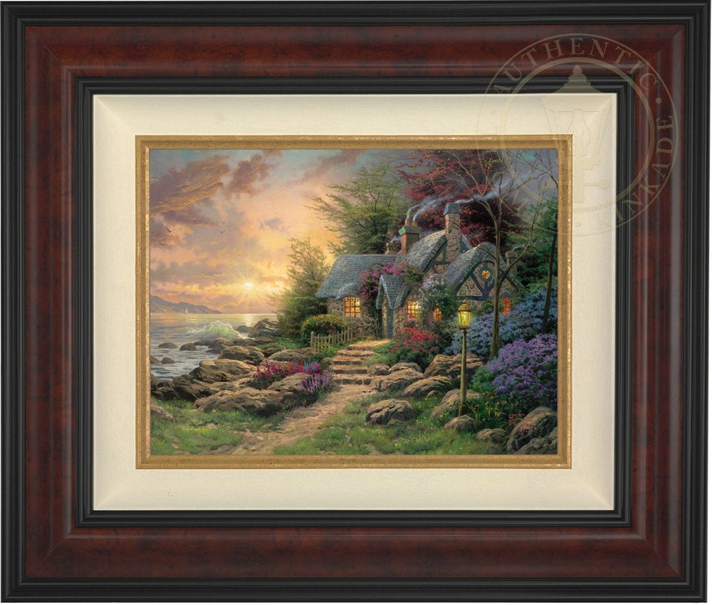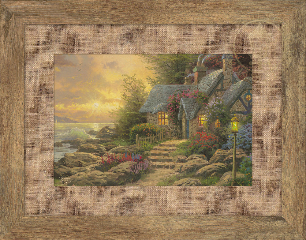 Seaside Hideaway evokes the mood of rapture we feel at such times. This is a glorious sunset; spray from the breaking waves drenches the air with mist, and a radiant light bathes clouds and swells with its golden glow, until the eye can scarcely tell where sky ends and sea begins. The towering, wispy clouds resemble angels in the searchlight of God's grace; gulls fly up toward the heavenly light.