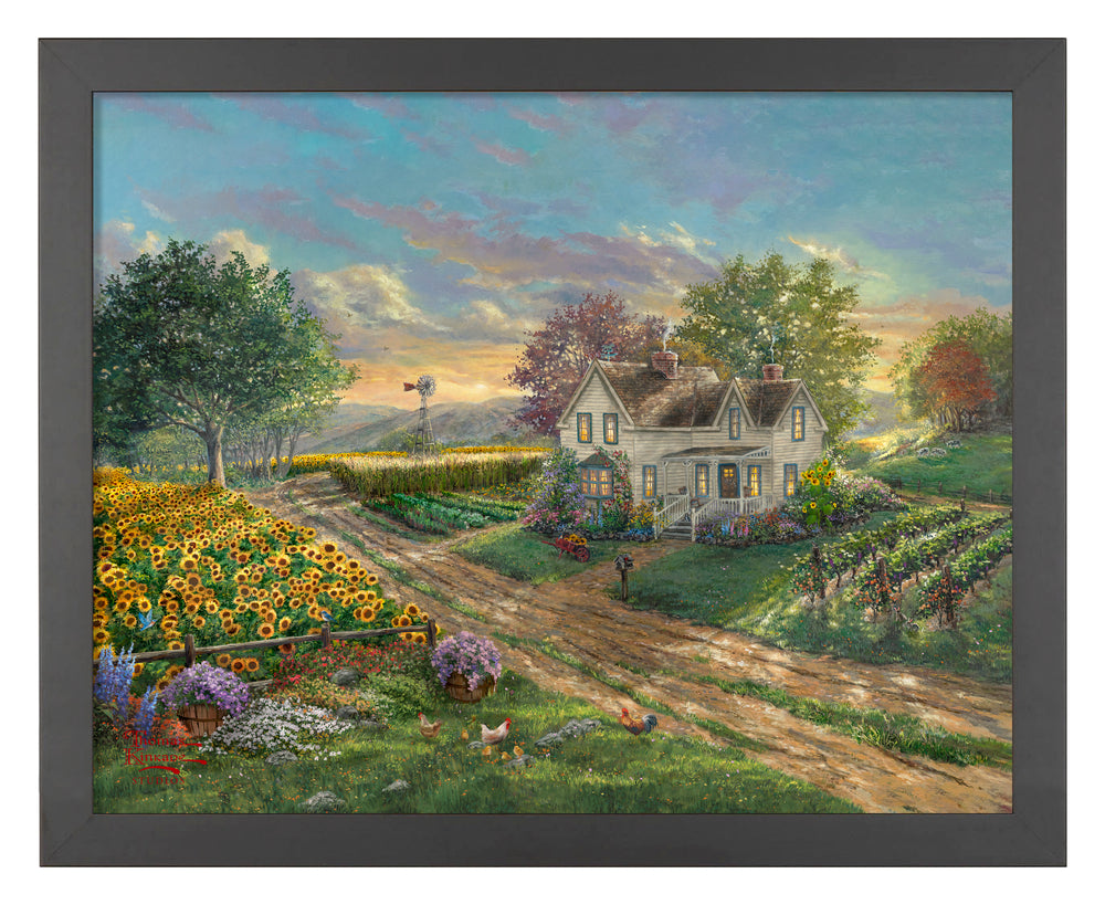 The founder of our Studio, Thomas Kinkade, loved to explore the world around him. He never ventured anywhere without a notepad and a pencil in his pocket so he could sketch what he saw. What might Thom, or any artist from his atelier, capture on canvas if they were to ramble upon a huge sunflower field? The artists of Thomas Kinkade Studios pondered this question, explored some of our nation’s beautiful farmlands, and put paint to canvas to create Sunflower Fields.