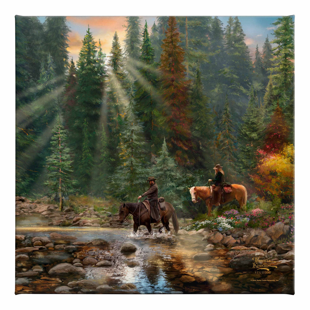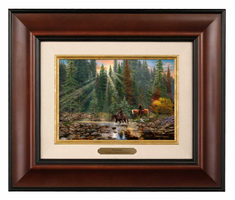 The Crossing by Thomas Kinkade Studios portrays two familiar riders on horseback fording a picturesque mountain stream after the end of a long cattle drive.