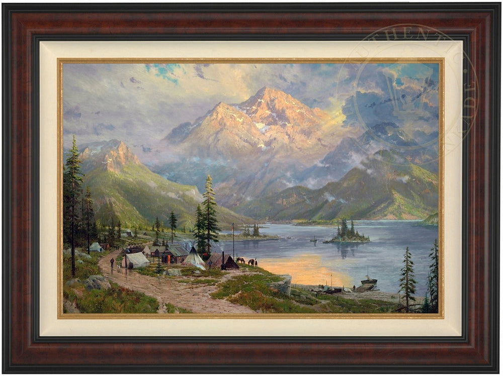 I placed my frontier camp under a majestic peak on the shores of a sylvan mountain lake. The presence of boats on shore suggests the harmony of man and nature, as it does in many of my mature landscapes. Smoke curls up from the tepee into the autumn sunset much as it will from chimneys of more conventional dwellings. The Edge of the Wilderness is a landmark from the earliest days of my career as the Painter of Light.